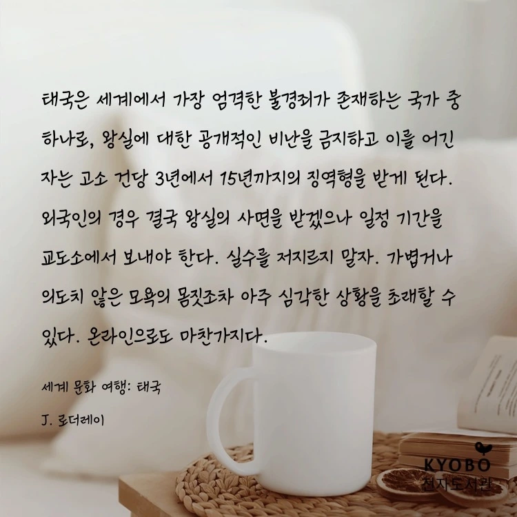 상황이 겉으로 어떻게 보이든 간에 세기가 바뀌면서 왕실은 점차 논란의 대상이 되어가고 있다. (...) 태국은 세계에서 가장 엄격한 불경죄가 존재하는 국가 중 하나로, 왕실에 대한 공개적인 비난을 금지하고 이를 어긴 자는 고소 건당 3년에서 15년까지의 징역형을 받게 된다. 외국인의 경우 결국 왕실의 사면을 받겠으나 일정 기간을 교도소에서 보내야 한다. 실수를 저지르지 말자. 가볍거나 의도치 않은 모욕의 몸짓조차 아주 심각한 상황을 초래할 수 있다. 온라인으로도 마찬가지다. 누구든 불경죄를 고발할 수 있고, 그러면 경찰이 고발 건마다 조사할 의무가 있다.