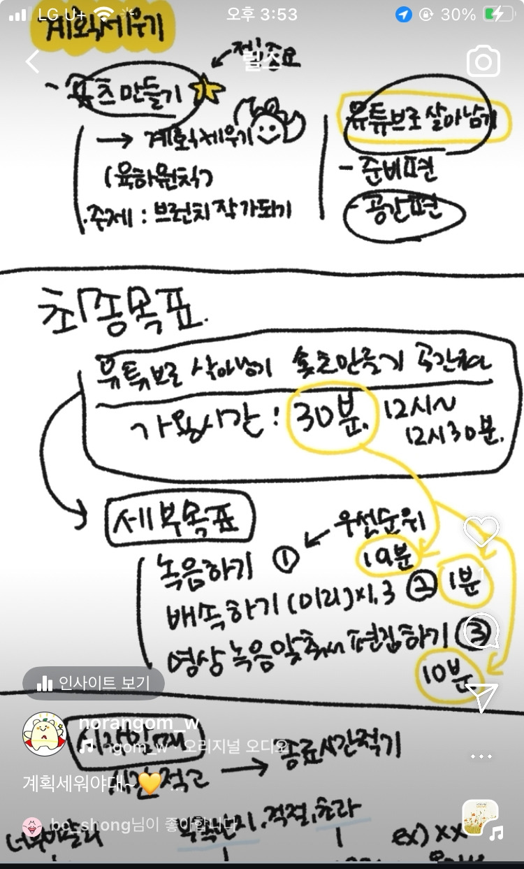 습관 만들기에 늘 실패하던 나는 최근 짧은 쇼츠나 릴스와 같은 콘텐츠에 관심을 가지게 되었다. 그래서 떠오른 것은 좋아하는 그림과 쇼츠를 합해서 계획그림을 매일 세우는 거다. 아침에 눈떠서 클립스튜디오(그림 그리는 프로그램)를 켜고 타임랩스(화면녹화)를 누른다. 그리고 계획을 세우고, 최종목표와 세부목표를 적는다. 그 옆에 소요 시간을 적고 우선순위를 표시한다. 마감시간이 정해졌으니 이것보다 빨리하거나 늦게 하면 이유를 적는다.
