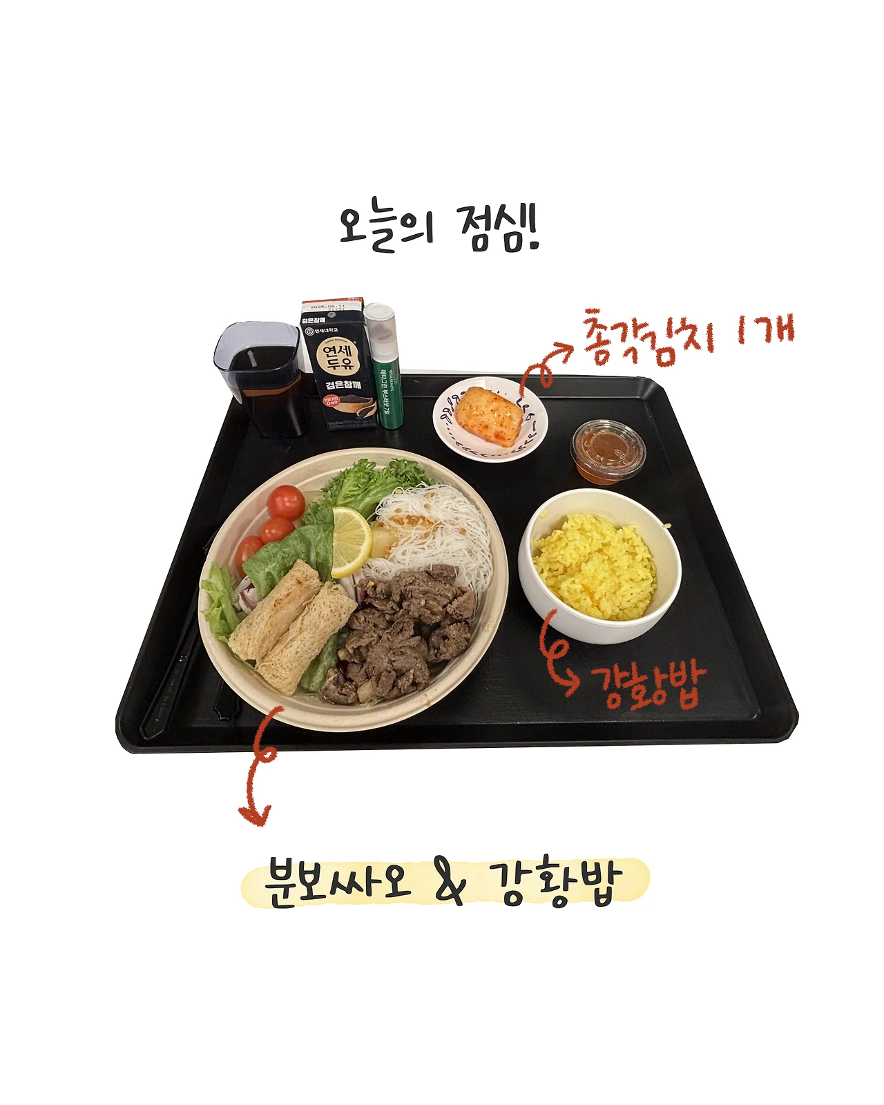 베트남 음식 하면, 매번 소고기 쌀국수만 먹었는데, 최근에 국물없이 비벼먹는 쌀국수를 엄청 맛있게 먹었었거든요! 이번에 그때와 비슷한 음식이 점심 샐러드로 나와서 즐겁게 먹었습니다.