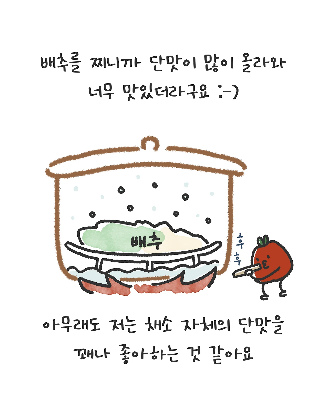 어쩌다보니 24시간 단식을 하고, 배가 너무 고파 일어나자마자 공복운동을 때리고 맛있는 아침밥을 먹었습니다. 오늘은 배추를 쪄서 먹었는데, 배추를 익히니까 채소 자체의 단맛이 극대화 되어서 너무 맛있더라구요.