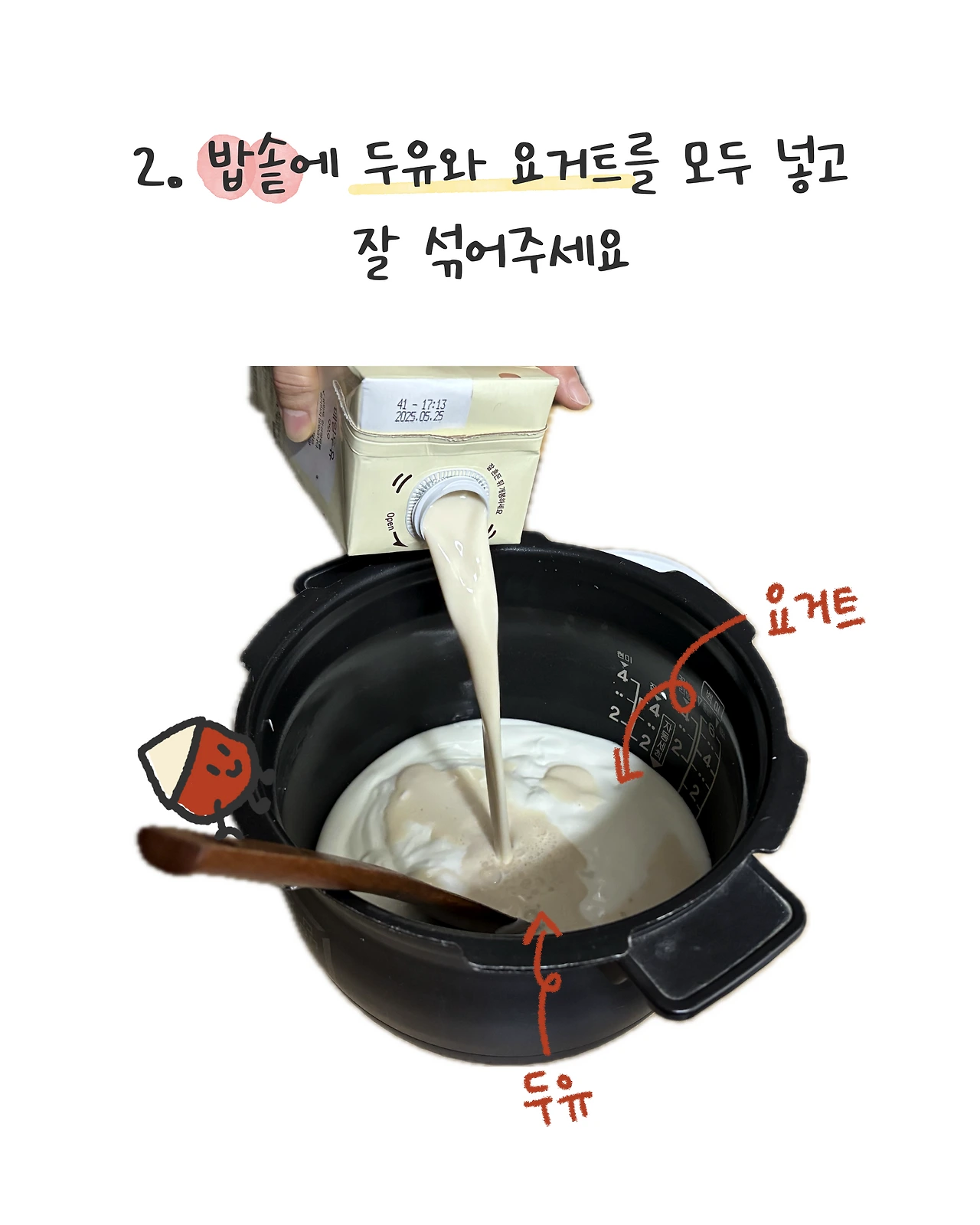 2. 밥솥에 두유와 요거트를 모두 넣고 섞어주세요.