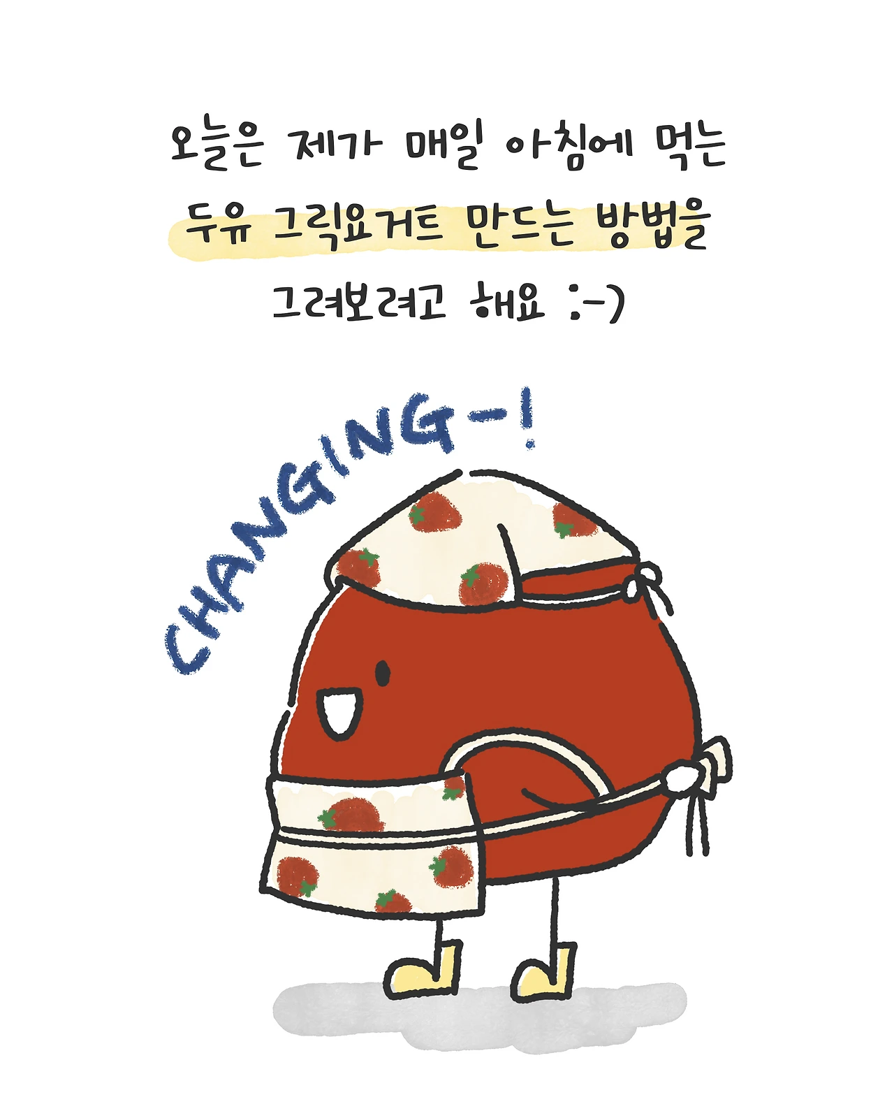 제가 매일 아침에 먹는 ‘두유 그릭 요거트’ 만드는 방법을 그려보았습니다. 저처럼 요거트의 신맛보다는 두유의 고소함을 좋아하시는 분들께 많이 많이 추천드려요. 생각보다 쉬우니 아래 방법을 참고해서 만들어보세요 :-)