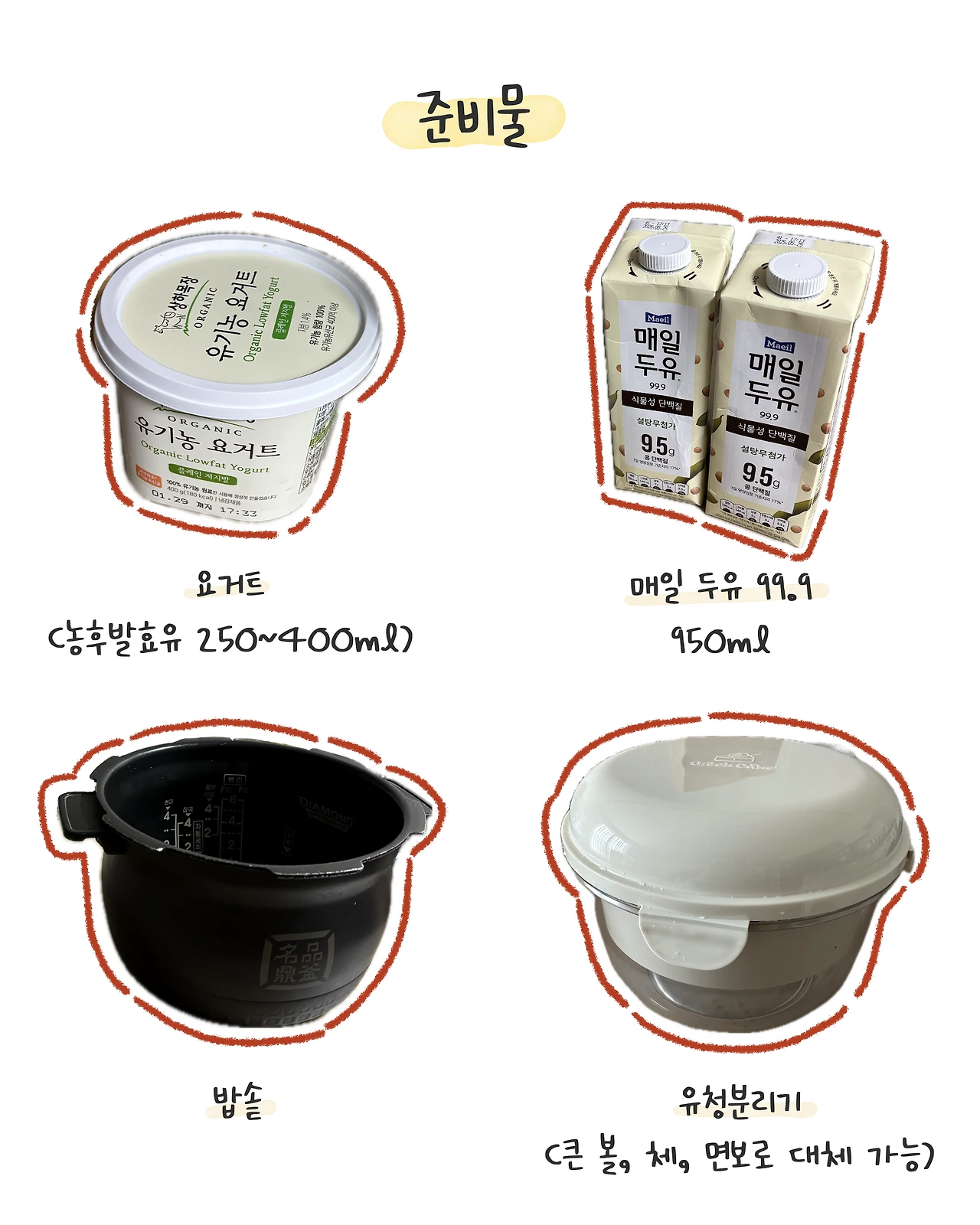 ෆ 준비물 : 요거트(농후발효유 250~400ml) 1개, 매일 두유 99.9 950ml 1개, 밥솥, 유청분리기
