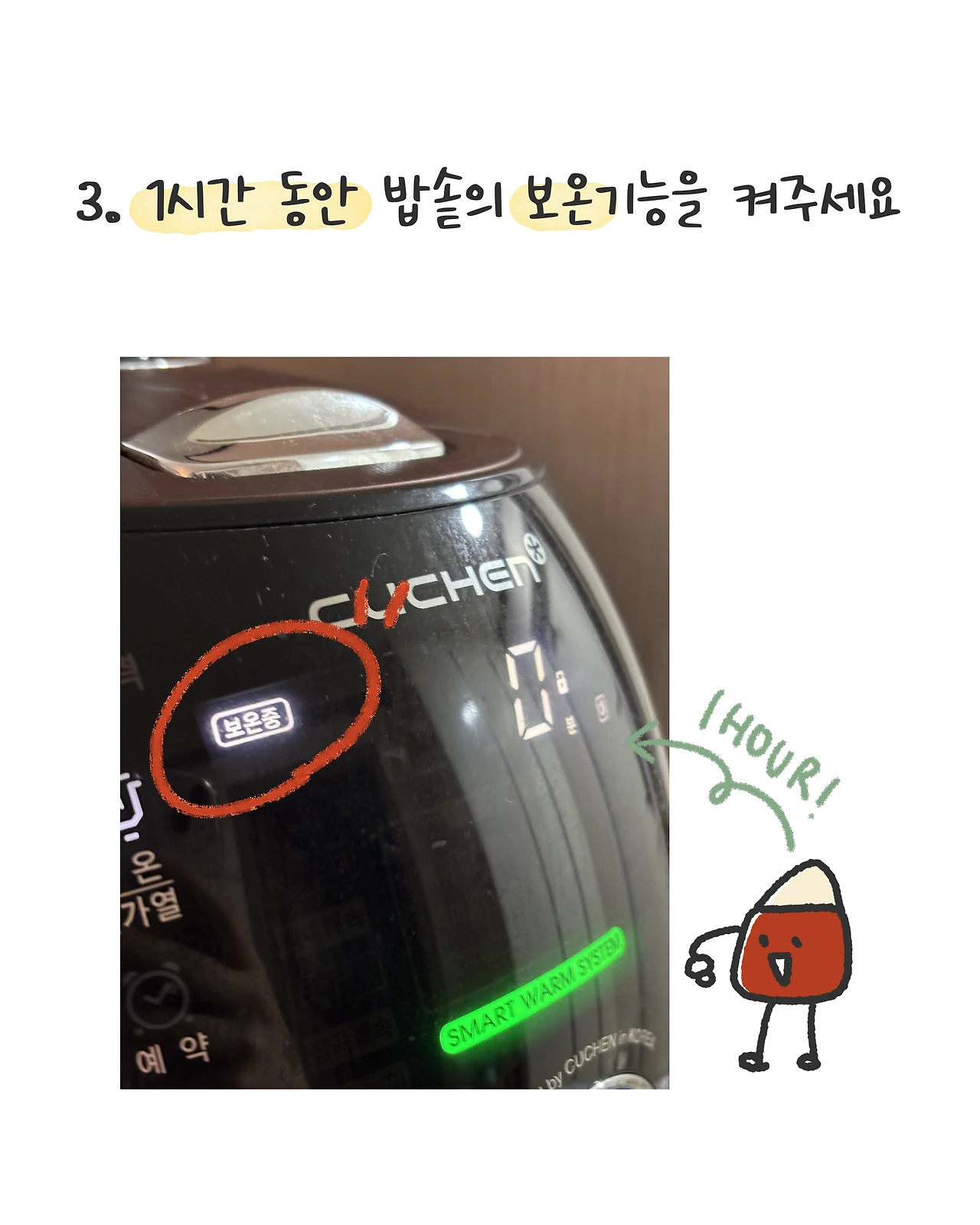3. 1시간 동안 밥솥의 보온기능을 켜주세요.