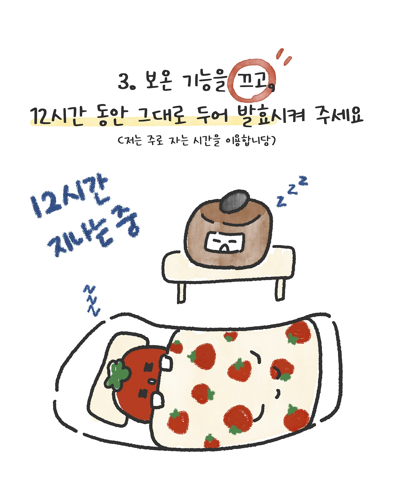 4. 보온기능을 끄고, 12시간 동안 그대로 두어 발효시켜 주세요.