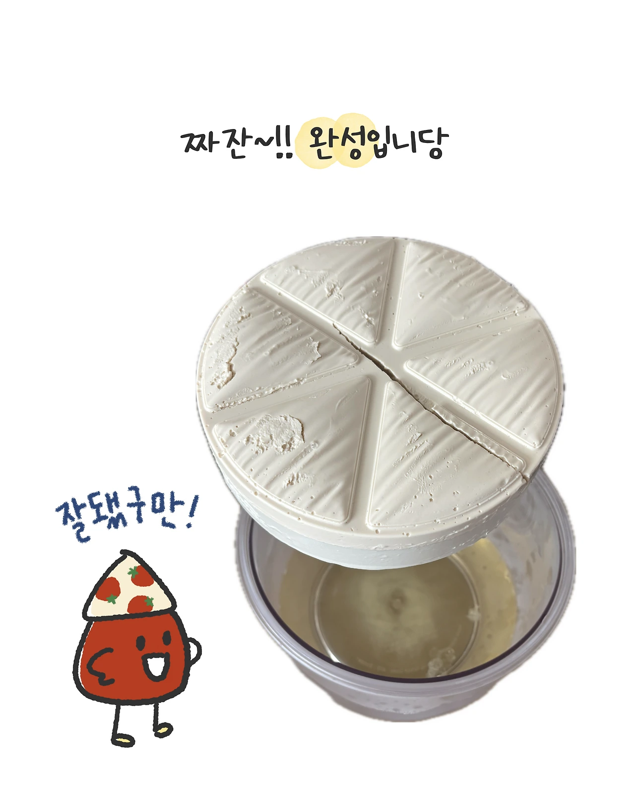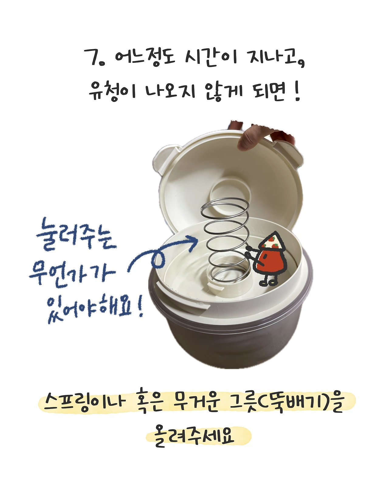 7. 어느정도 시간이 지나고, 유청이 나오지 않게 되면, 스프링이나 혹은 무거운 그릇(like 뚝배기)을 올려놔주세요.