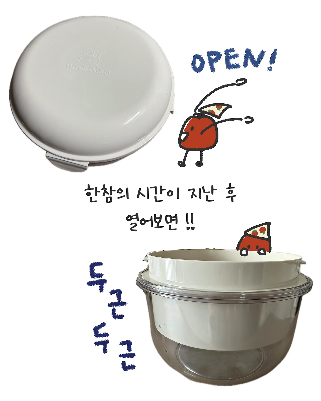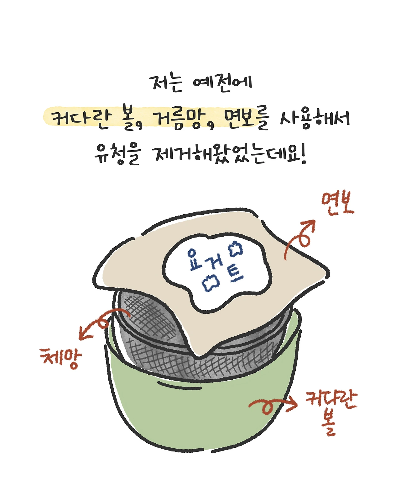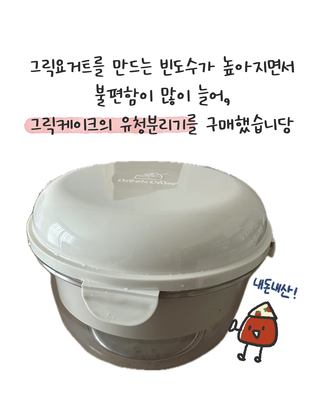 저는 예전에 커다란 볼과 거름망 + 면보를 사용해서 유청을 제거해왔었는데요! 생각보다 불편함 감이 있어서, 그릭케이크의 유청분리기를 구매했습니당