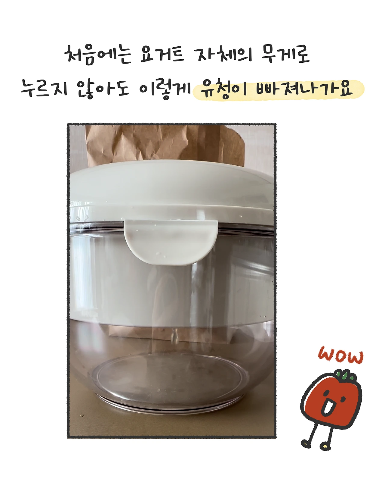 처음에는 자체적으로 무게가 나가서 이렇게 누르지 않아도 이렇게 유청이 빠져나가요.
