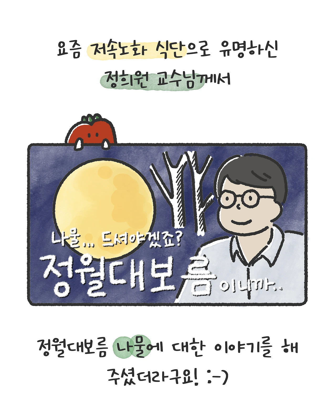 요즘 저속노화 식단으로 유명하신, 정희원 교수님께서 정월대보름 나물에 대한 이야기를 해주셨더라구요!