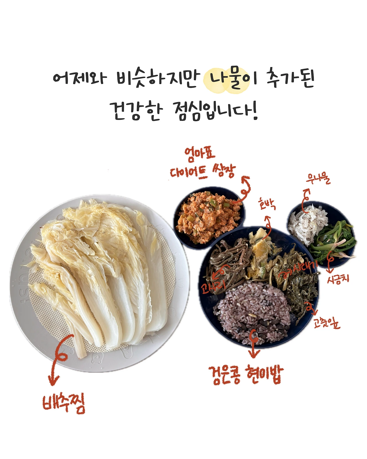 어제와 비슷하지만 나물이 추가된 맛있는 점심입니당