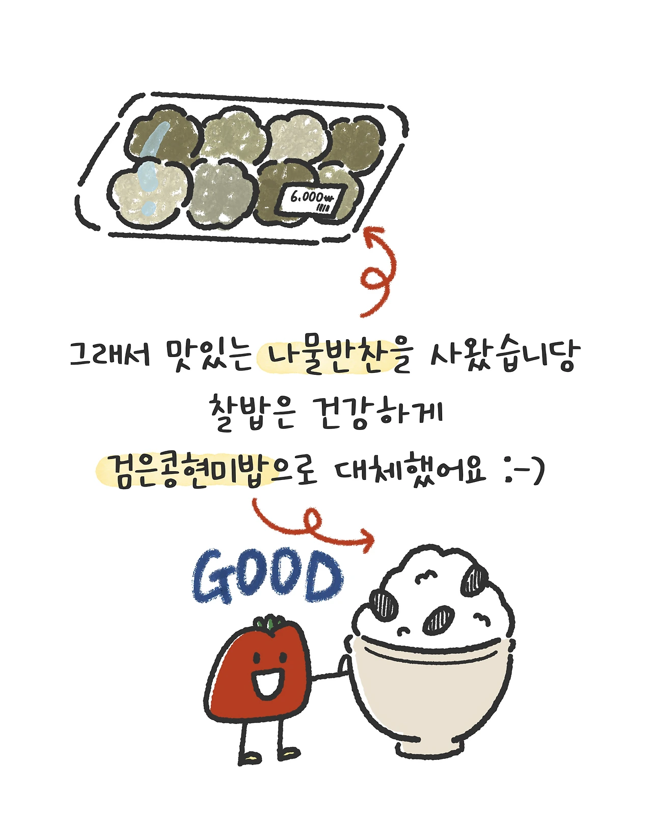 그래서 덕분에 나물반찬을 사왔습니당 찰밥은 건강하게 검은콩현미밥으로 대체했어요 :-)