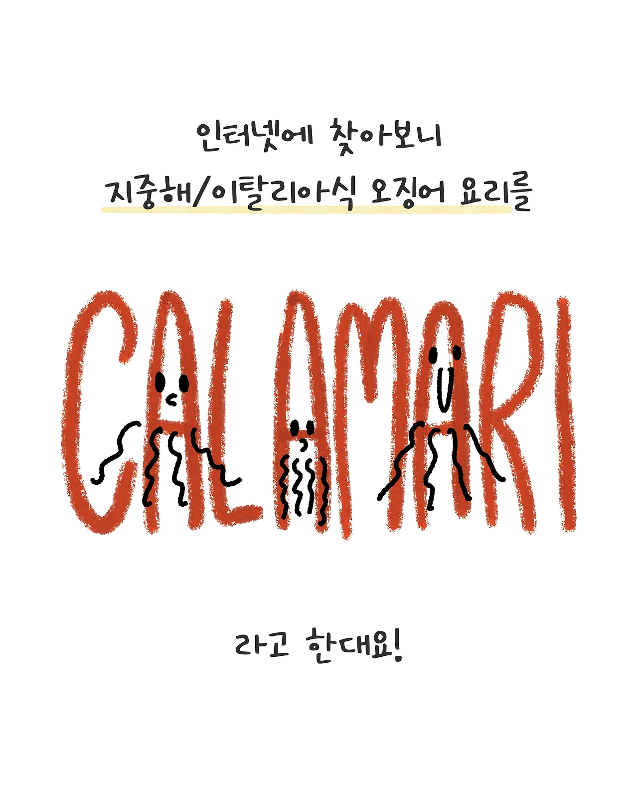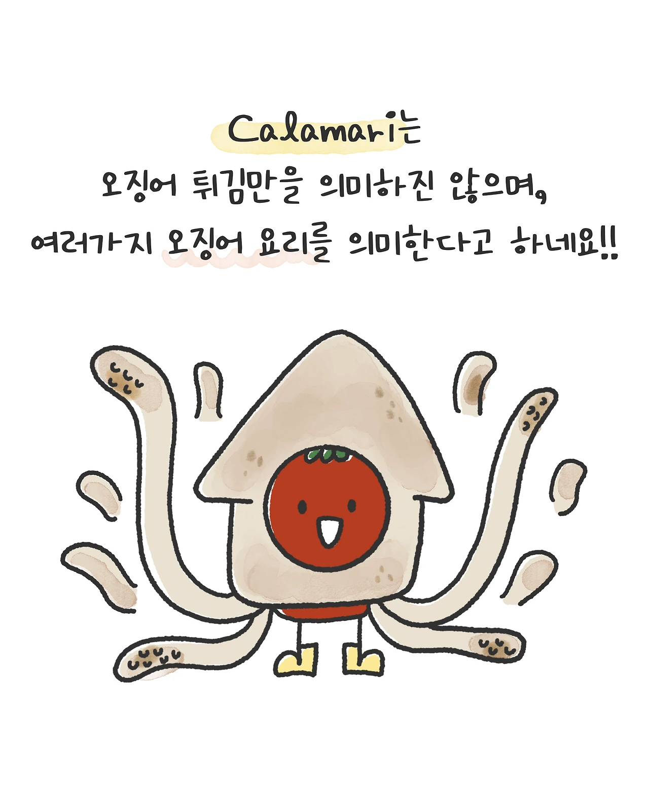 새롭게 알게된 깔라마리 샐러드는 오징어 튀김(그 외에도 여러가지 오징어 요리를 통칭함) 샐러드 였습니다.