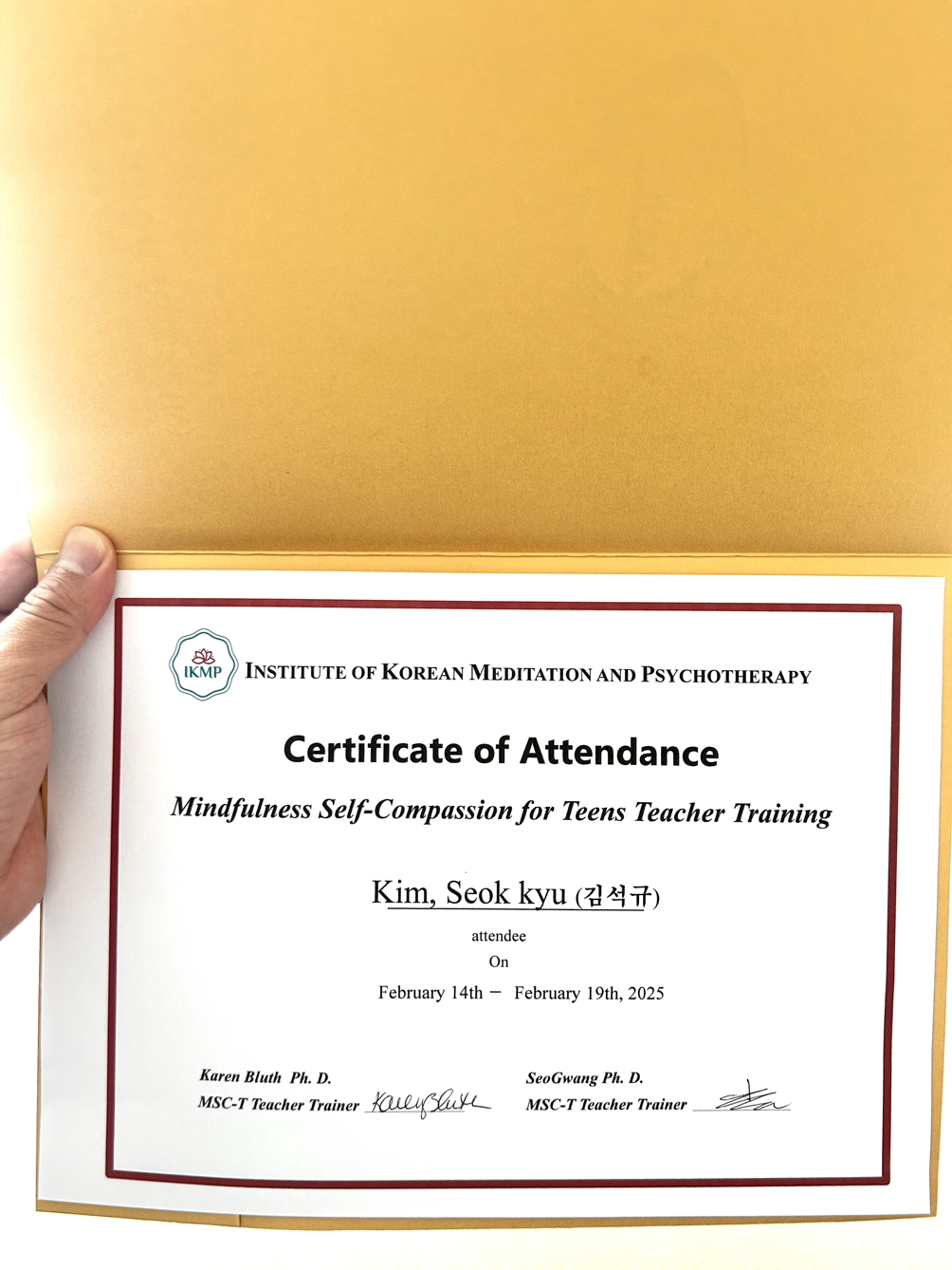 나는 최근 오대산 자연명상마을 '옴뷔'에서 5박 6일 간청소년을 위한 마음 챙김 지도자 과정(MSC-T)을 수료했다. 이 과정은 미국에서 개발된 프로그램으로 유럽과 아시아에서도 보급되고 있으며 올해 한국에서 이 과정이 개설된다는 소식을 듣고 작년부터 수료하기 위한 까다로운 절차들을 준비해 왔다. 나는 이 과정을 공부하면서 마음 챙김이 청소년들에게 얼마나 중요한지를 다시금 깨달았다.