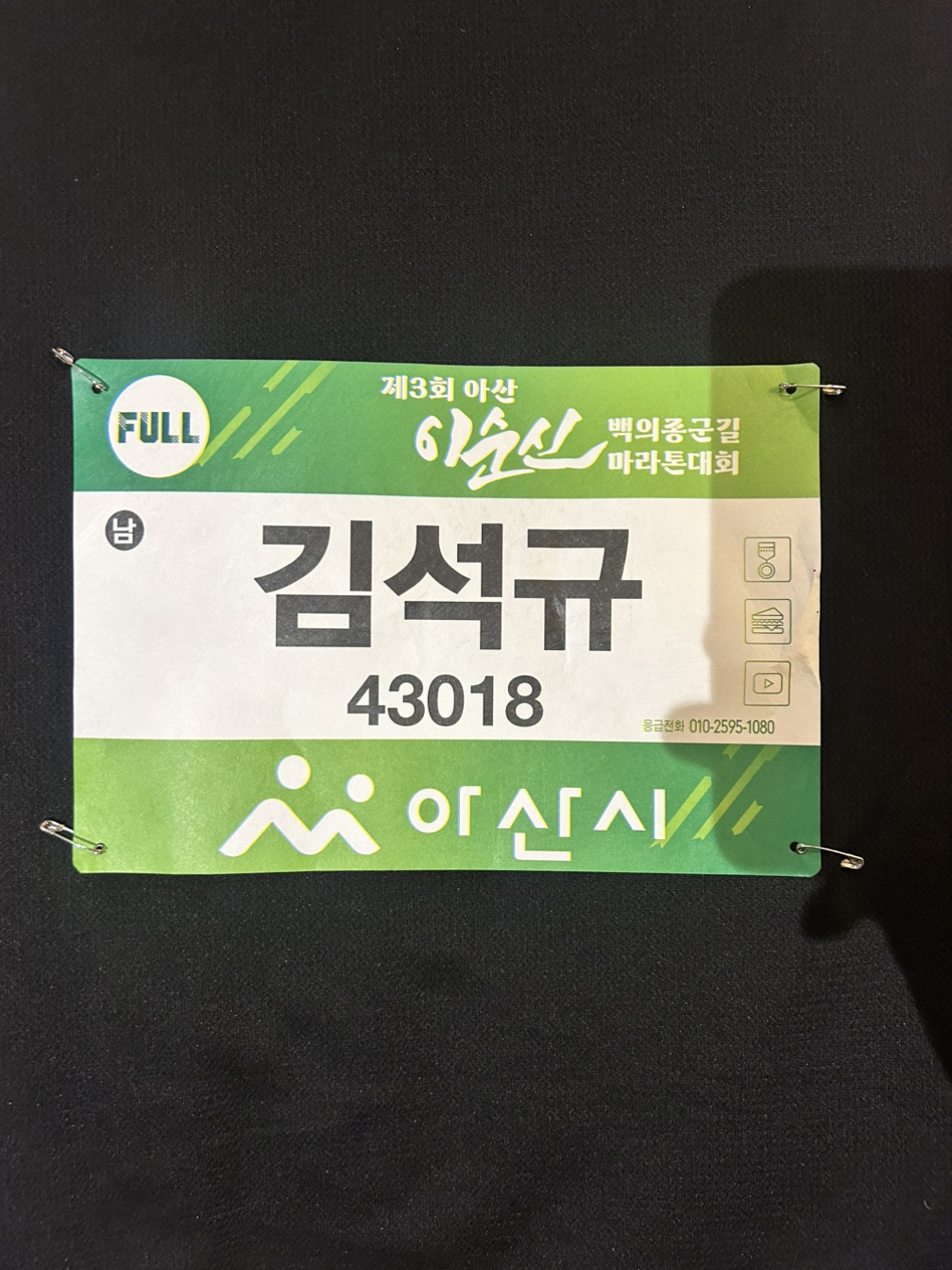 대회 전날 아산에 도착하여 나름대로 컨디션을 조절하고 비장한 마음으로 배번호를 달았다. 풀코스의 배번호는 10km나 하프코스 배번호보다 무겁게 느껴졌다. 준비를 마친 후 풀코스를 뛰는 모습을 상상하며 잠이 들었다.