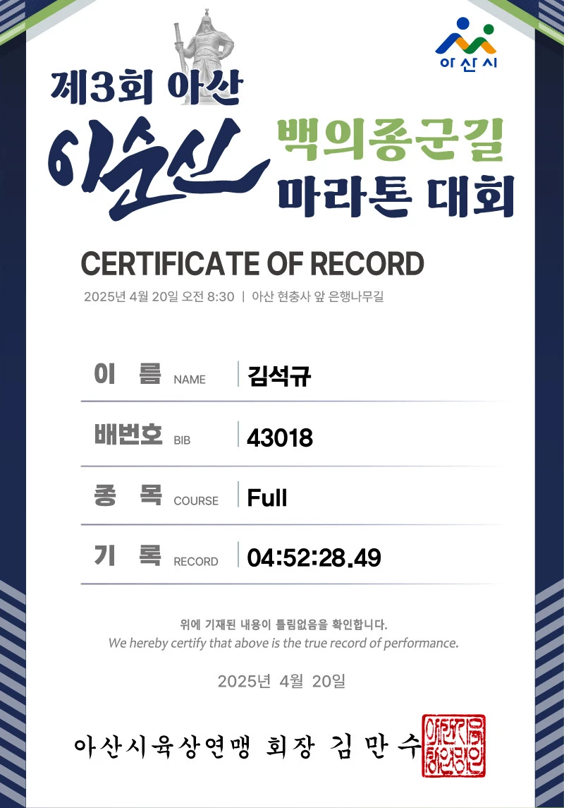 나는 이번 충남 아산 이순신 백의종군 마라톤 대회에 풀코스 선수로 참가했다. 작년 연초부터 10km 대회에 첫 도전한 후 7개의 10km 대회에 참가했고, 올해부터는 하프코스를 뛰기 시작했다. 그리고 드디어 풀코스까지 도전할 용기가 났다.