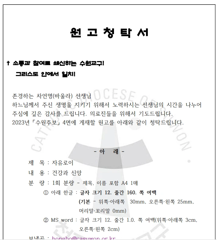 신부님은 현재 수원교구 홍보국에서 일하시는데, 내 블로그에 신앙 글 적은 것을 읽어 보았다고 말씀하셨습니다. 습작에 대해 칭찬해 주시는 말씀에 부끄러움이 확 밀려왔답니다. 그리고 저에게 2023년 수원 주보의 4면에 실릴 글을 부탁하셨습니다. 즉 원고 청탁을 부탁하신 거지요. 갑자기 가슴이 콩탁콩탁했답니다. 웬만하면 성당 관련 부탁은 "Yes."라고 대답하는 편이지만, 원고 청탁은 몇 초간 망설여졌습니다.