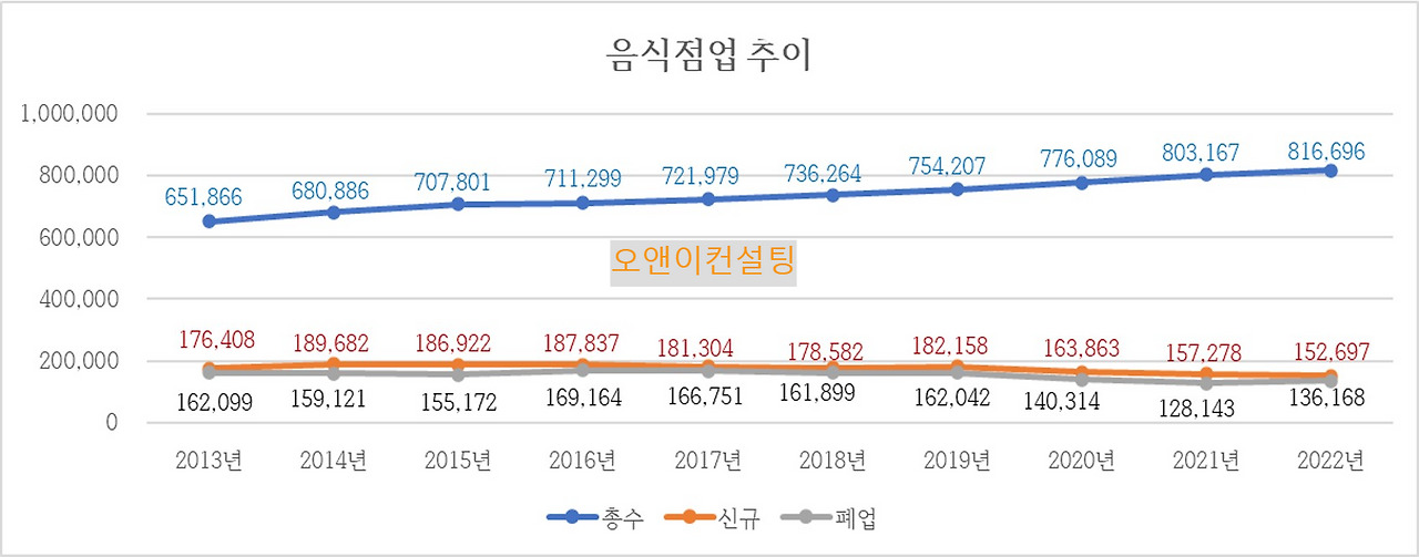 음식점업 신규창업은 2013년 17만6408개에서 2022년 13만6168개로 코로나19 이후 3년 연속 감소하고 있고 폐업 역시 2013년 16만2099개에서 2022년 13만6168개로 코로나19 이후 2년 연속 감소하다가 2022년 6.26% 증가하는 모습을 보인다.