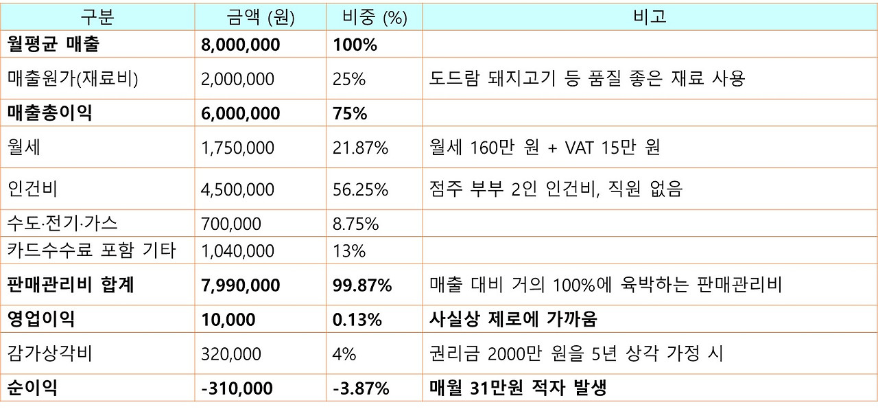 일반적으로 외식업 재료비는 매출의 35% 내외가 적정선입니다. 이 가게의 재료비는 25%로, 언뜻 보면 재료 관리를 잘하는 것처럼 보입니다. 그런데 왜 적자일까요? 문제는 다른 곳에 있습니다. 아래 손익계산표가 보여주는 것은 단순한 숫자가 아니라, 사장님 부부의 피와 땀이 어떻게 사라지고 있는지에 대한 냉혹한 기록입니다. 참고: 세금은 면세 가정, 감가상각비는 권리금 2천만 원을 5년으로 나눈 금액입니다.