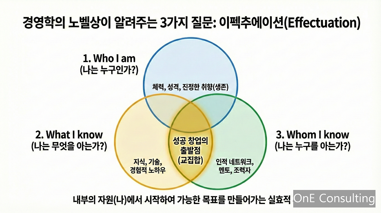 사라스바티 교수의 이펙추에이션 이론에 따르면, 성공적인 창업과 점포 개발의 첫 단추는 다음 세 가지 질문의 교집합을 찾는 것입니다. 이 질문에 명확히 답하지 못한다면, 아직 전쟁터에 나갈 준비가 되지 않은 것입니다.