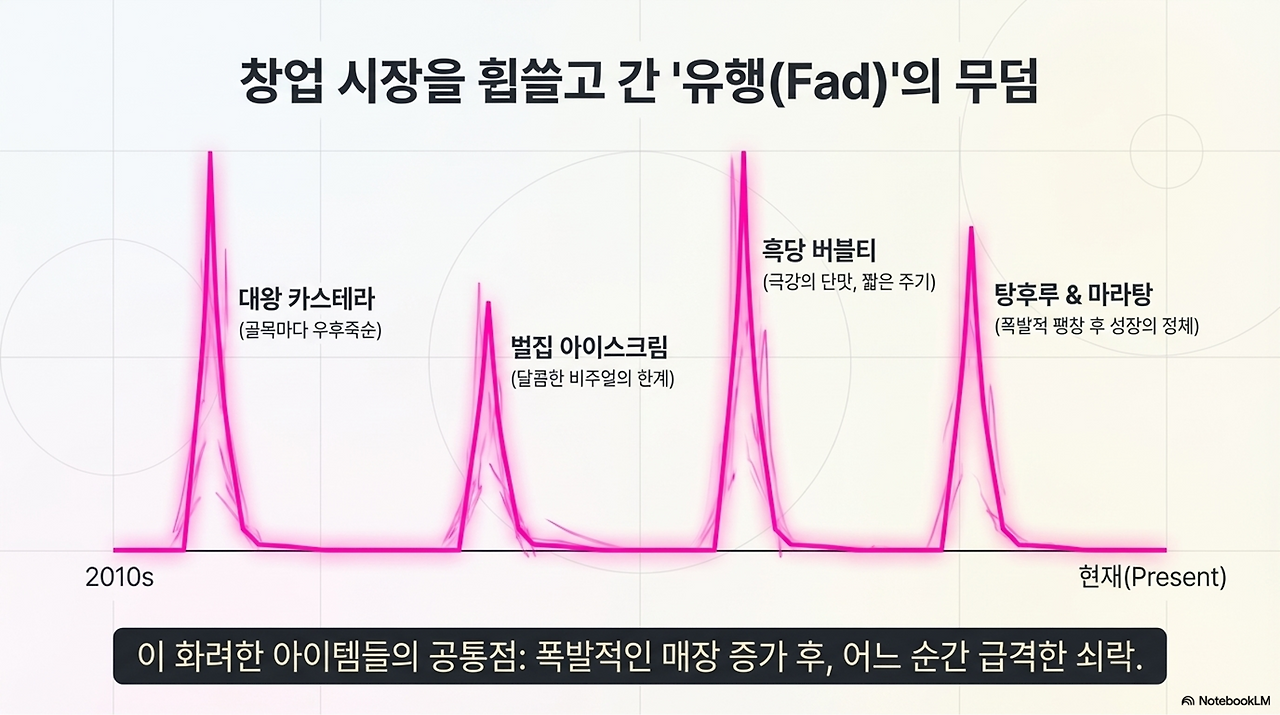 이 화려한 아이템들의 공통점은 명확합니다. 폭발적인 속도로 매장이 늘어났다가, 어느 순간 성장이 멈추거나 급격히 쇠락의 길을 걸었다는 점입니다.