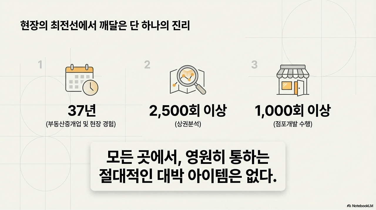 '모든 곳에서, 영원히 통하는 절대적인 대박 아이템은 없다'라는 것입니다. 성공적인 점포개발은 뜬구름 잡는 '감'이 아니라, 철저한 '과학'입니다.