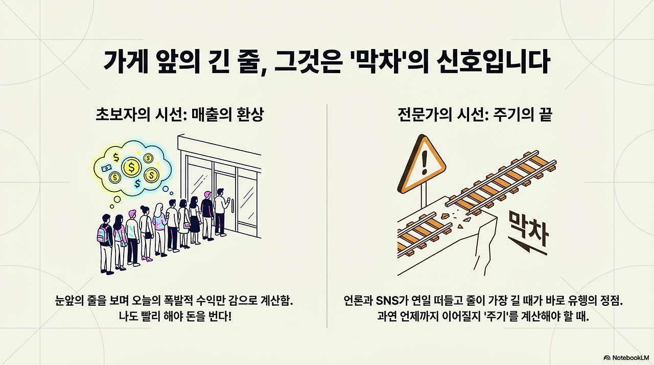 제가 과거 7곳의 프랜차이즈 기업에서 점포개발을 총괄하며 가장 경계했던 것이 바로 이 과열된 아이템이었습니다. 명심하십시오. 가게 앞에 길게 늘어선 줄을 보고 창업을 결심했다면, 이미 늦은 것입니다. 남들이 다 뛰어들어 시장이 뜨거워졌을 때 진입하는 것은, 곧 막차를 타는 행위와 다름없습니다.