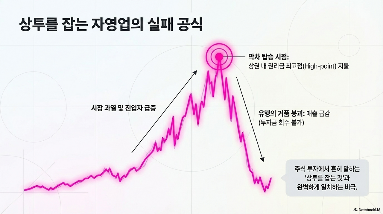 이 시기에는 상권 내 점포의 권리금마저 최고점 (High-point)에 달해 있습니다. 비싼 비용을 치르고 화려하게 오픈하지만, 정작 문을 열고 나면 유행의 거품이 빠지며 매출이 꺾이는 비극. 이것이 바로 주식 투자에서 흔히 말하는 '상투를 잡는 것'과 완벽하게 일치하는 자영업의 실패 공식입니다.