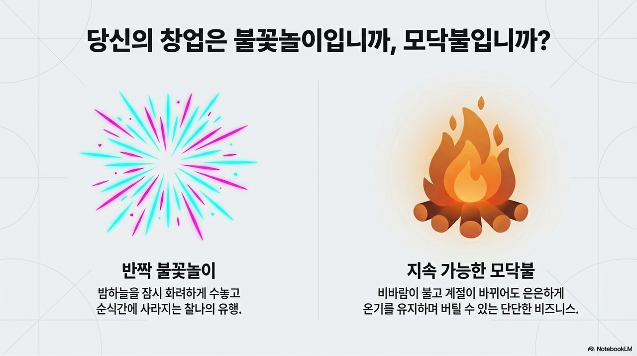 우리가 찾아야 할 것은 밤하늘을 잠시 화려하게 수놓고 사라지는 '반짝 불꽃놀이'가 아닙니다. 비바람이 불고 계절이 바뀌어도 은은하게 온기를 유지하며 버틸 수 있는 지속 가능한(Sustainable) 모닥불이어야 합니다.