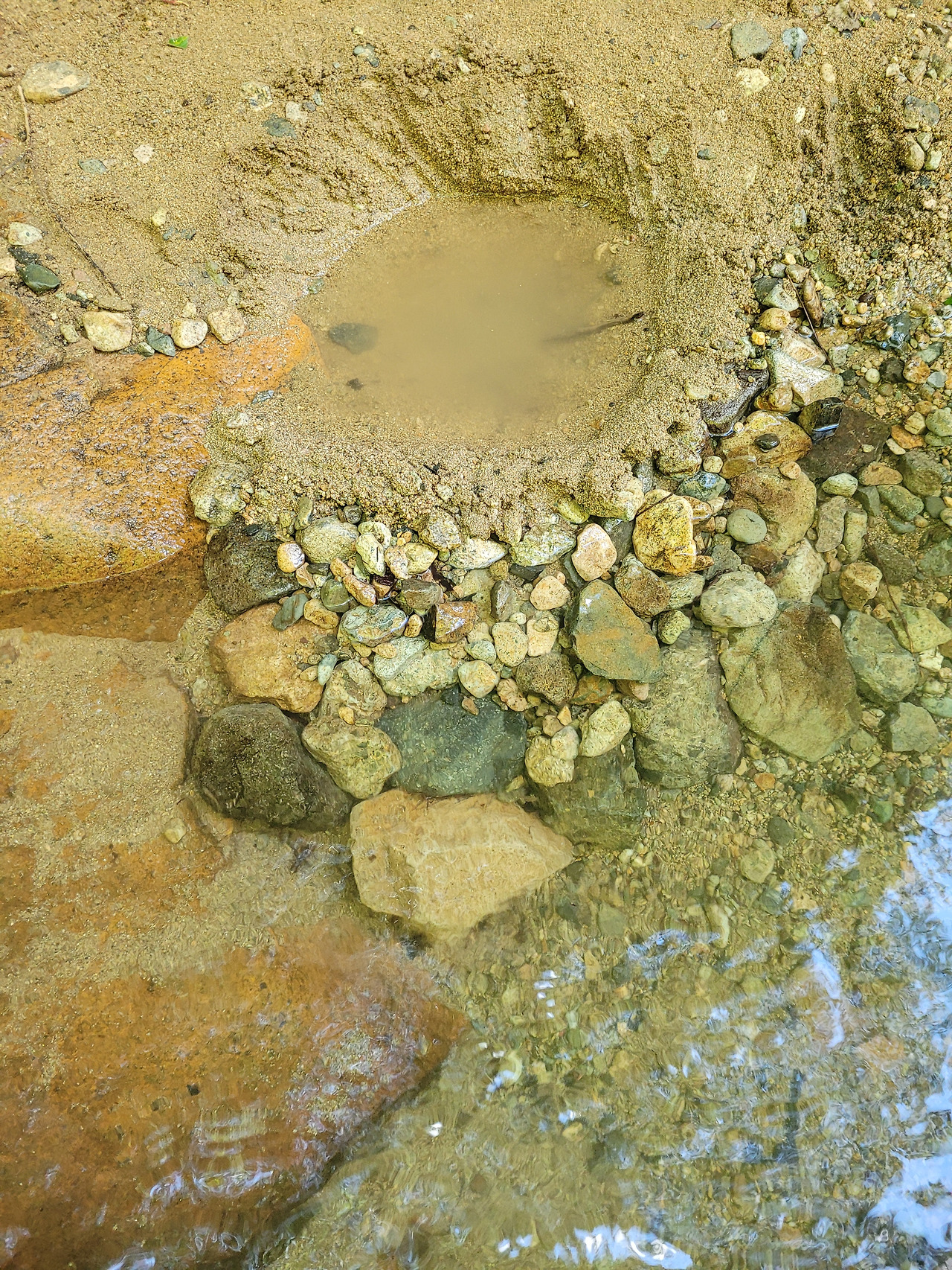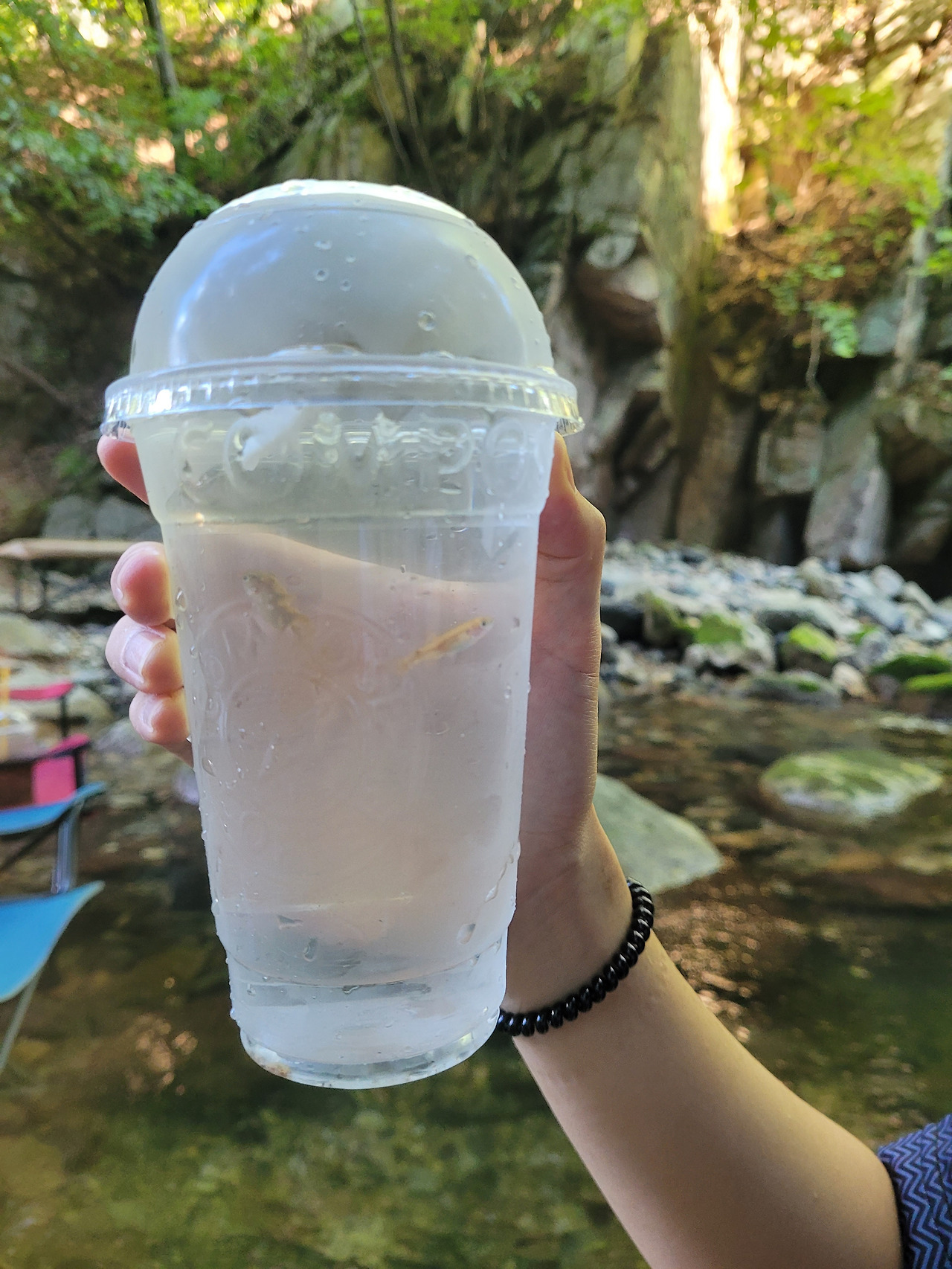 그러고는 아메리카노를 담았던 플라스틱 통에 만두를 조금 떼어 다 넣더니 물속 돌 틈에 끼워둔다. 거기로도 버들치 2마리가 잡혔다.