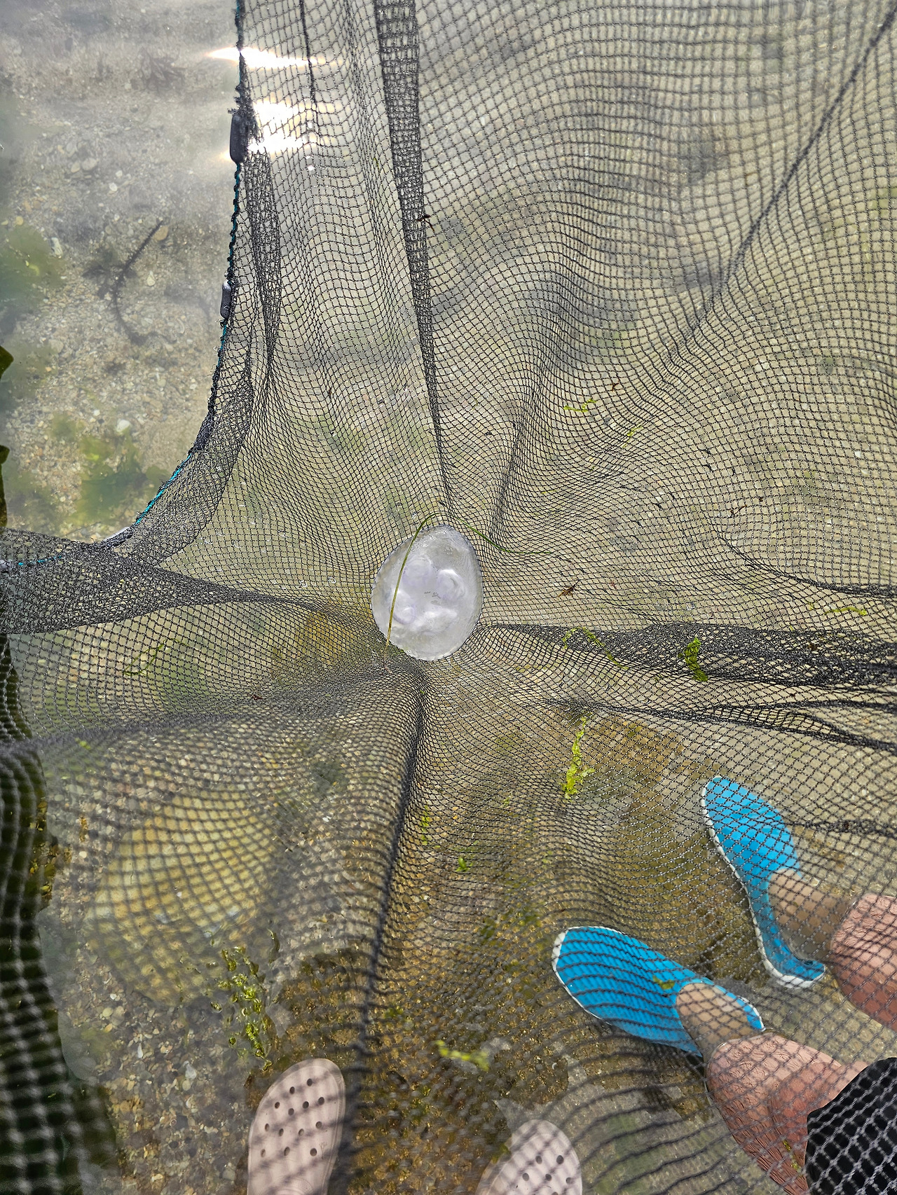 망둥어는 이름도 망충한 느낌이라더니, 바다에 처음 온 사람에게 10cm 조금 더 되는 큰 녀석이 잡혔다. 가져간 해루질용 반두로 수초 쪽을 그냥 한번 털었는데, 그만 잡아버렸다. 크기에 놀라서 연신 소리를 질러댔더니 주변의 초등학생들이 부럽게 쳐다본다. 그걸 자랑이라도 하듯이 아이들이 많은 곳을 가로질러 다니다가 다시 잡히지 말라며 풀어주고는 열대어 같은 예쁜 물고기를 다시 잡았다.