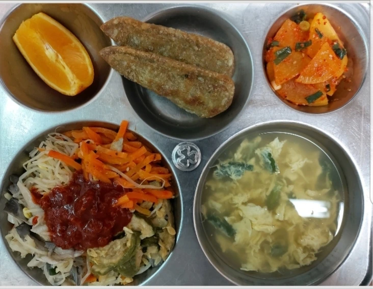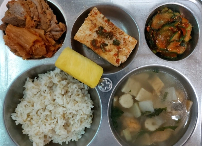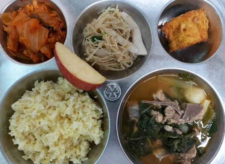 초등학교 고학년들도 함께 먹어서인지 살짝 매콤해 보이는 참치김치찌개, 돼지고기 김치볶음, 돼지등뼈 감자탕, 고추장이 들어간 비빔밥 등의 메뉴들이 있었다.