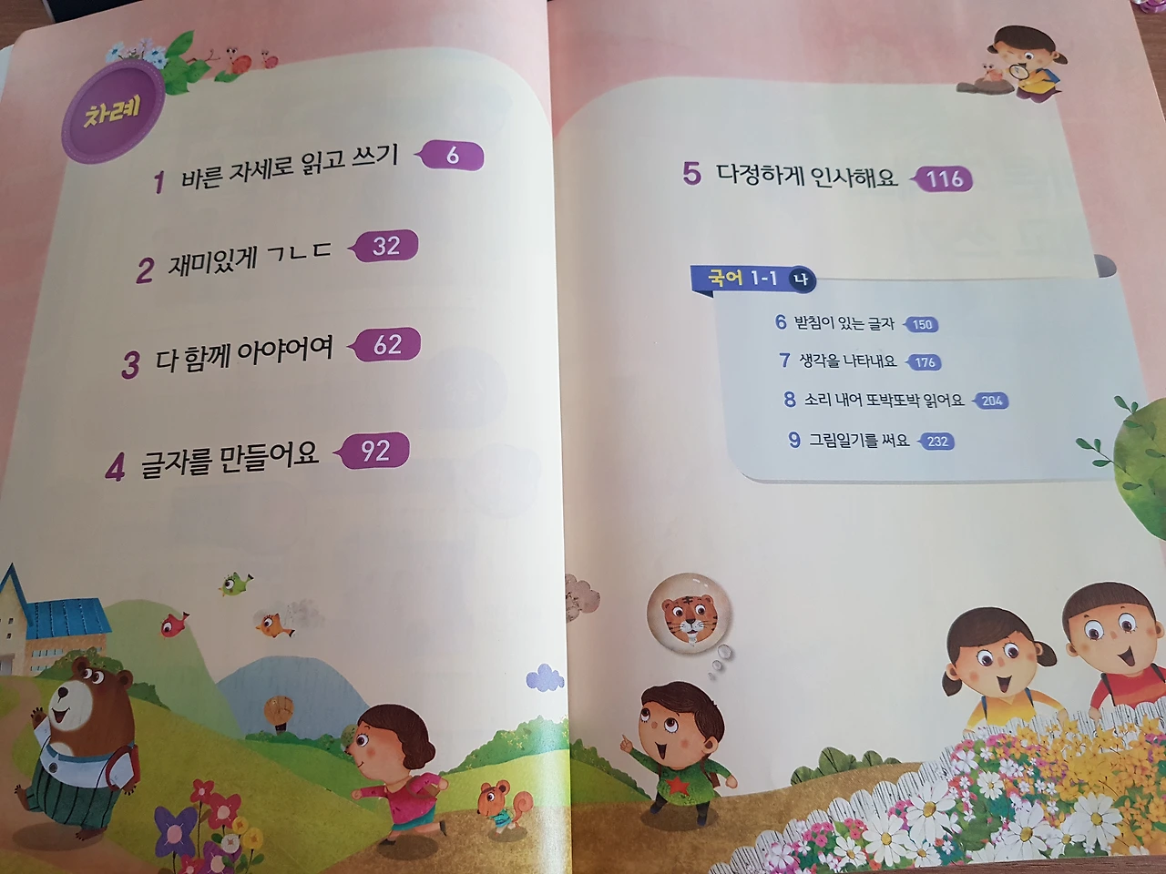 초등학교 1학년 국어 1-1 가 교과서 목차 아이가 하교를 한 후에 국어책을 목차부터 같이 살펴보았다.