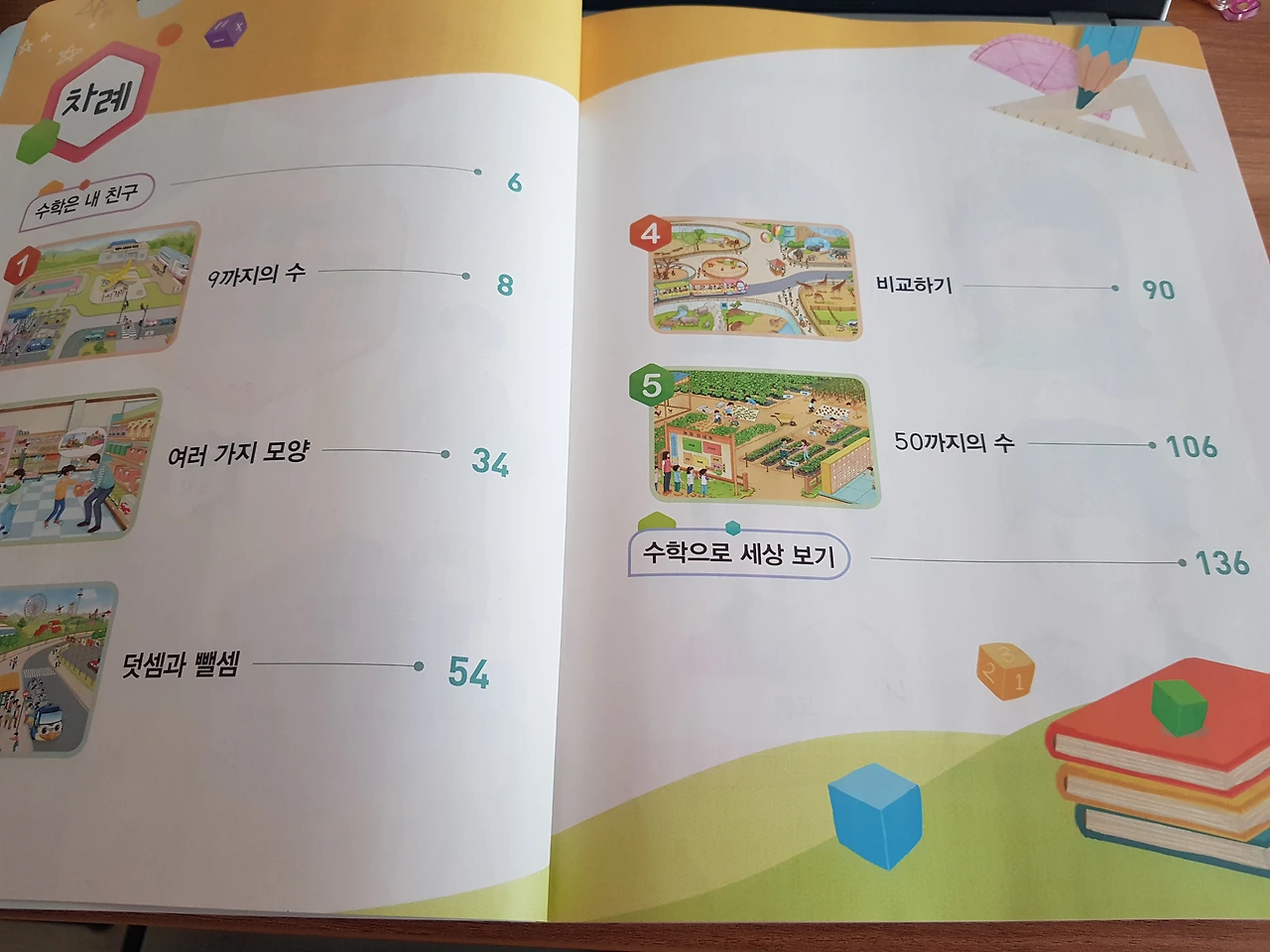 초등학교 1학년 수학 교과서 목차 수학 교과서는 국어와 달리 한 권으로 되어있었고 아이들이 이해하기 쉽게 숫자에 대해 여러 활동들을 해 볼 수 있게 구성이 되어있었다. 1단원에서는 9까지의 숫자를 익히고 2단원에서는 상자 모양, 원기둥, 구 모양에 대해서 익히고 3단원에서는 덧셈과 뺄셈 4단원에서는 길다, 짧다, 크다, 무겁다와 같은 비교에 대해서 배우고 마지막 5단원에서는 50까지의 수를 배우고 마무리가 되었다. 1학기 내내 0부터 50까지의 수를 익히고 주변에서 볼 수 있는 물건들의 모양이나 사물의 비교, 간단한 덧셈 뺄셈을 배우니 수학은 아이들에게 큰 무리가 없어 보였다.