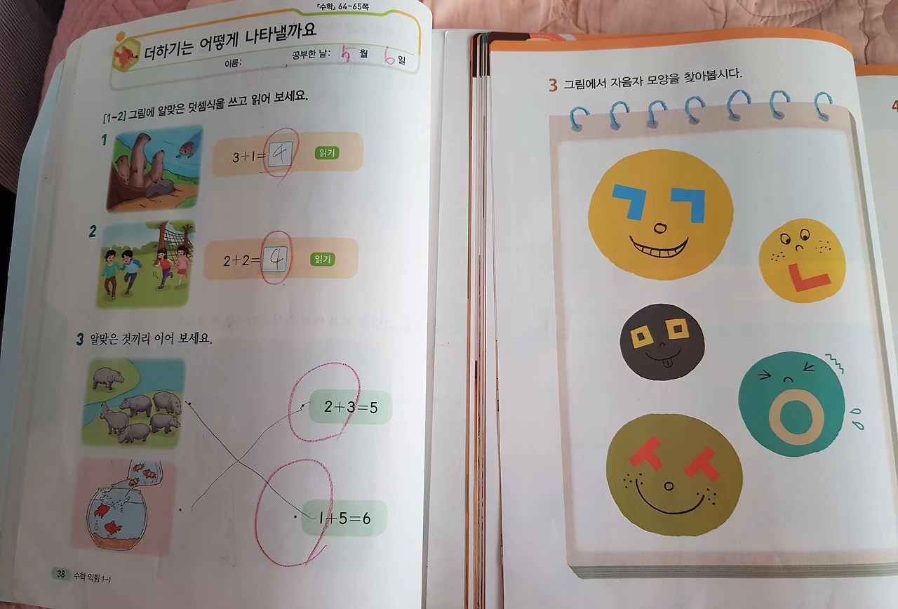 수학익힘책과 국어 교과서 같은 페이지. 다른 느낌 하지만 국어와 수학 교과과정의 난이도가 진도를 나가면 나갈수록 조금 다르다는 생각이 들었다. 국어 교과서 38페이지에서는 "자음자 모양을 찾아봅시다."라고 쓰여 있어서 아이들이 여러 표정들에서 ㄱ,ㄴ,ㅁ,ㅅ,ㅇ을 쉽게 찾을 수 있는데 반해 수학익힘책에서는 같은 페이지에 1,2번 문제가 특히 아이들이 하기에는 조금은 어려워 보였다. 물론 그림을 보고 덧셈식을 세우는 건 간단해 보였다. 하지만 옆에 덧셈식을 한글로 읽어보라고 쓰여 있었다. 여기서 말하는 읽기란 (1번 문제를 예로 들어보겠다.)