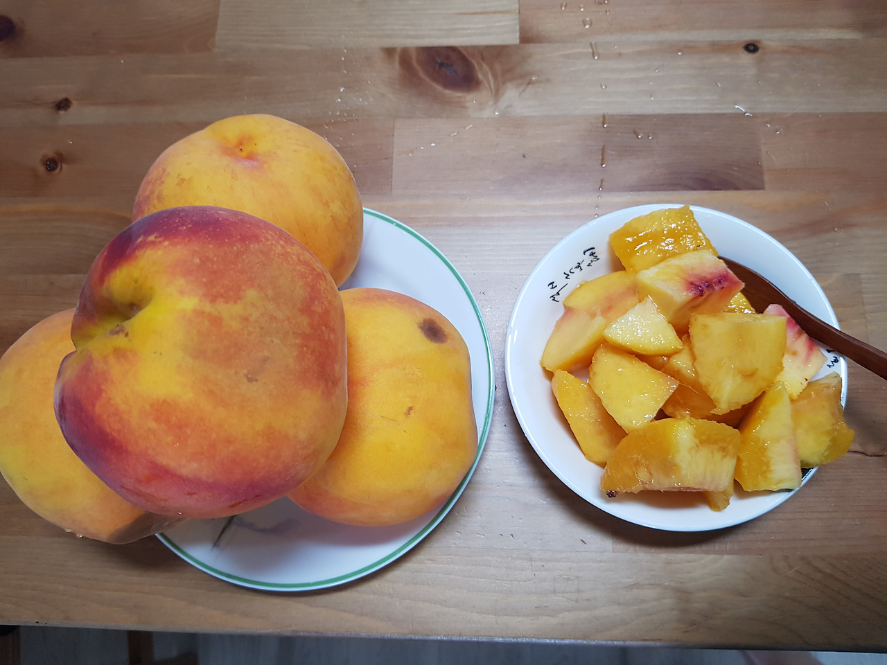 집에 오자마자 복숭아를 깨끗이 씻고 상한 부분을 잘 도려내고 껍질을 벗겨서 예쁘게 썰었다. 접시에 내어놓으니 아이들은 언제 흠이 있던 복숭아였냐는듯이 바쁘게 포크질을 해댔다. 나도 썰어놓은 복숭아를 하나 집어 먹어보았다. 너무나 달콤해서 입 안에서 살살 녹았다. 어느새 접시 한가득 담겨있던 복숭아가 금세 동이 났다. 그 후로도 아이들은 복숭아를 두 개 정도 더 먹었고 배가 봉긋하게 올라왔다.