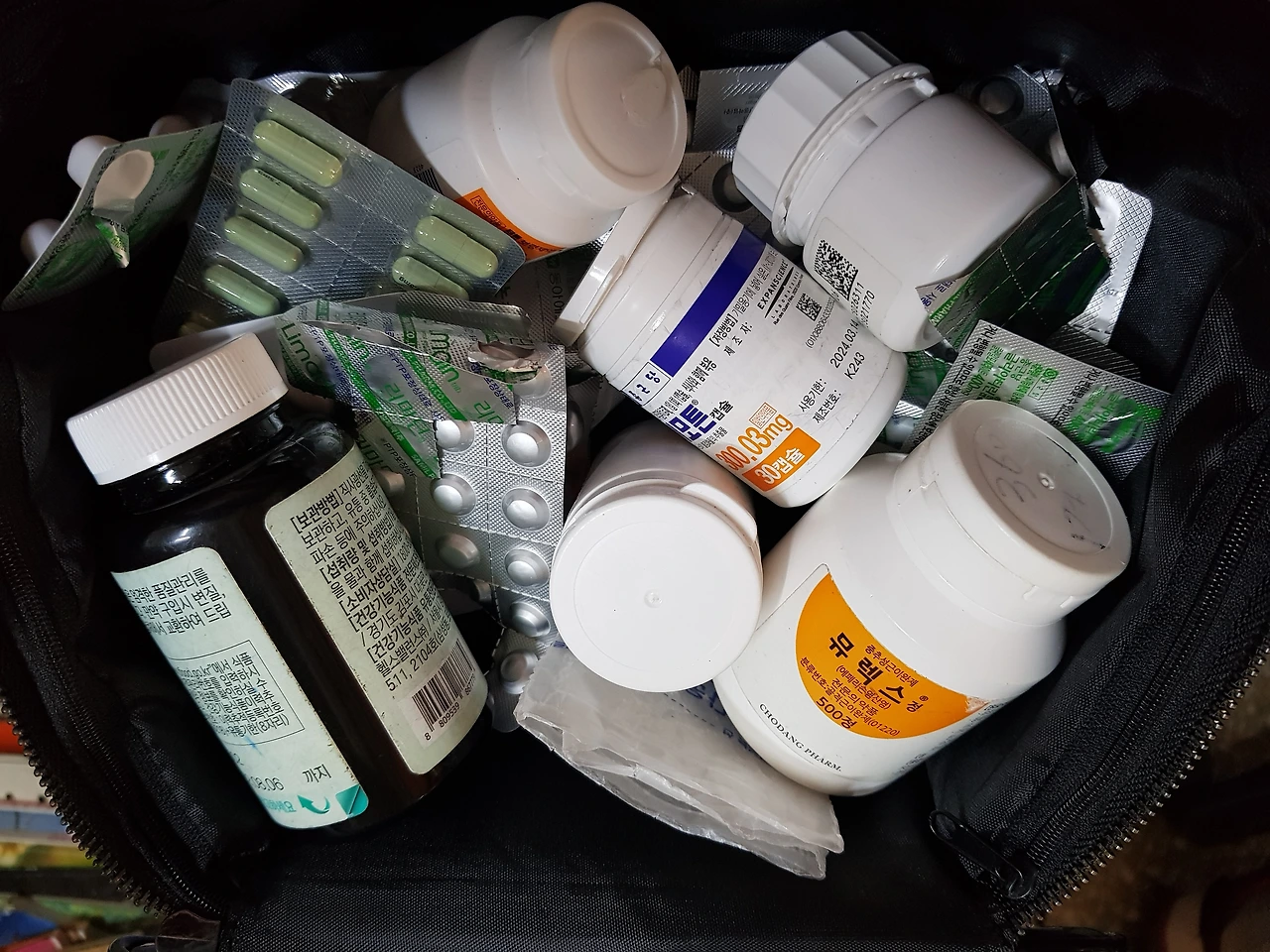 엄마의 가게에서 우연히 커다란 검은색 화장품 파우치를 보았다. 속에 샘플 로션이나 핸드크림 같은 화장품이 들어있을 것 같아 열어보았다. 하지만 파우치 속엔 화장품은 하나도 없었고 뮤렉스, 이모튼같이 외계어 같은 이름이 붙어있는 약들만 잔뜩 들어있었다. 자세히 들여다보았더니