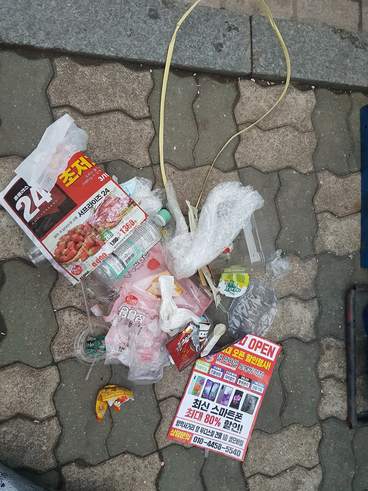 다행히 보름달 빵 봉지와 비닐장갑, 캔 커피, 종이컵, 초코파이 봉지, 갈비탕 봉지, 과자 플라스틱 트레이, 마트 전단지, 노끈 등은 내가 주울 수 있었다.
