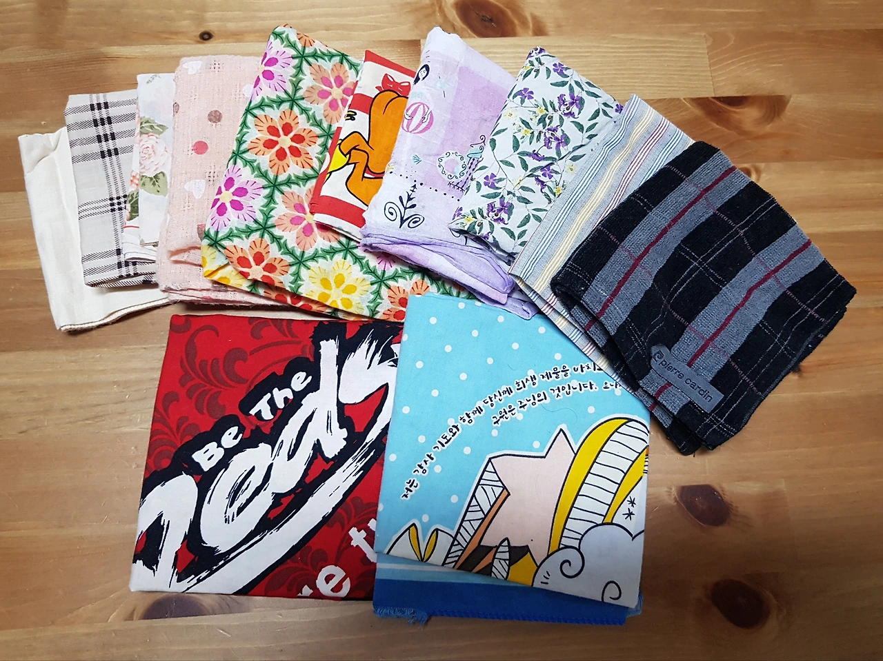 그래서 사두었던 물티슈를 눈에 보이지 않는 곳으로 치워두고 집에 있는 손수건들을 다 모아 꺼내보았다.