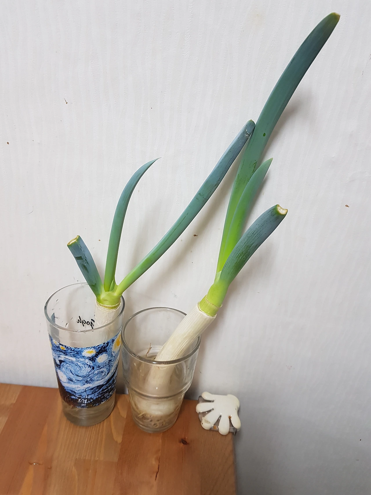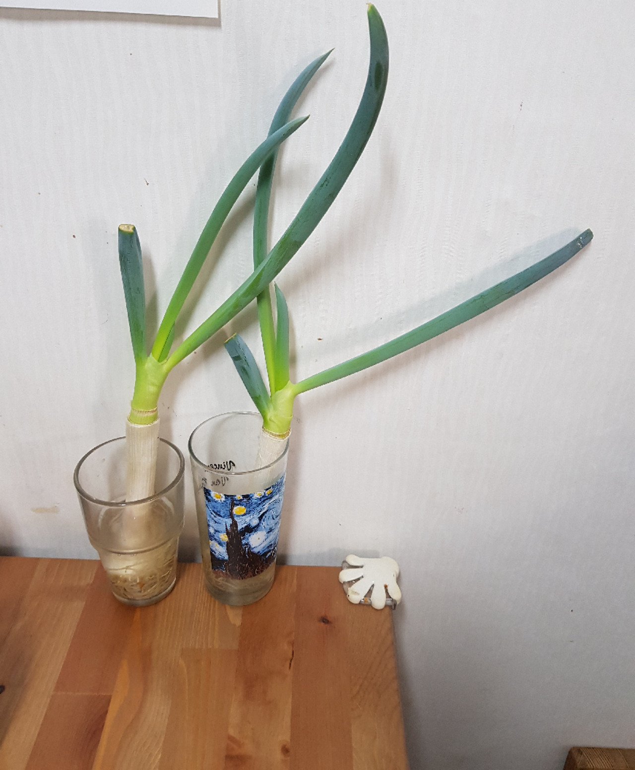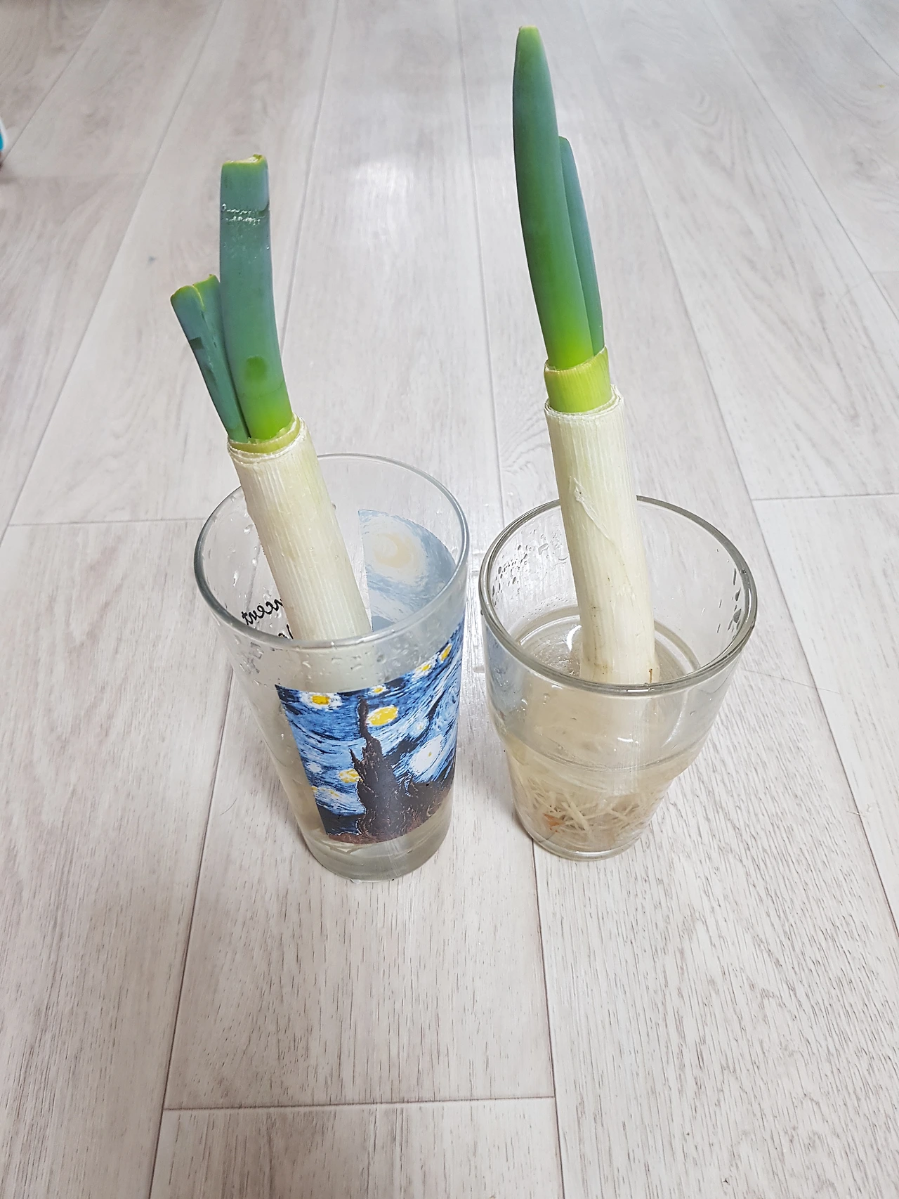 대파의 뿌리가 있는 쪽의 흰 줄기를 약 15cm 정도로 잘라서 유리컵에 넣고 물을 부어 기르기 시작했다. 기르는 방법은 아주 간단했다. 매일같이 물만 새로 갈아주면 되어서 그 어떠한 식물도 다 죽인 망손인 나 같은 사람도 기르기가 매우 간편했다.