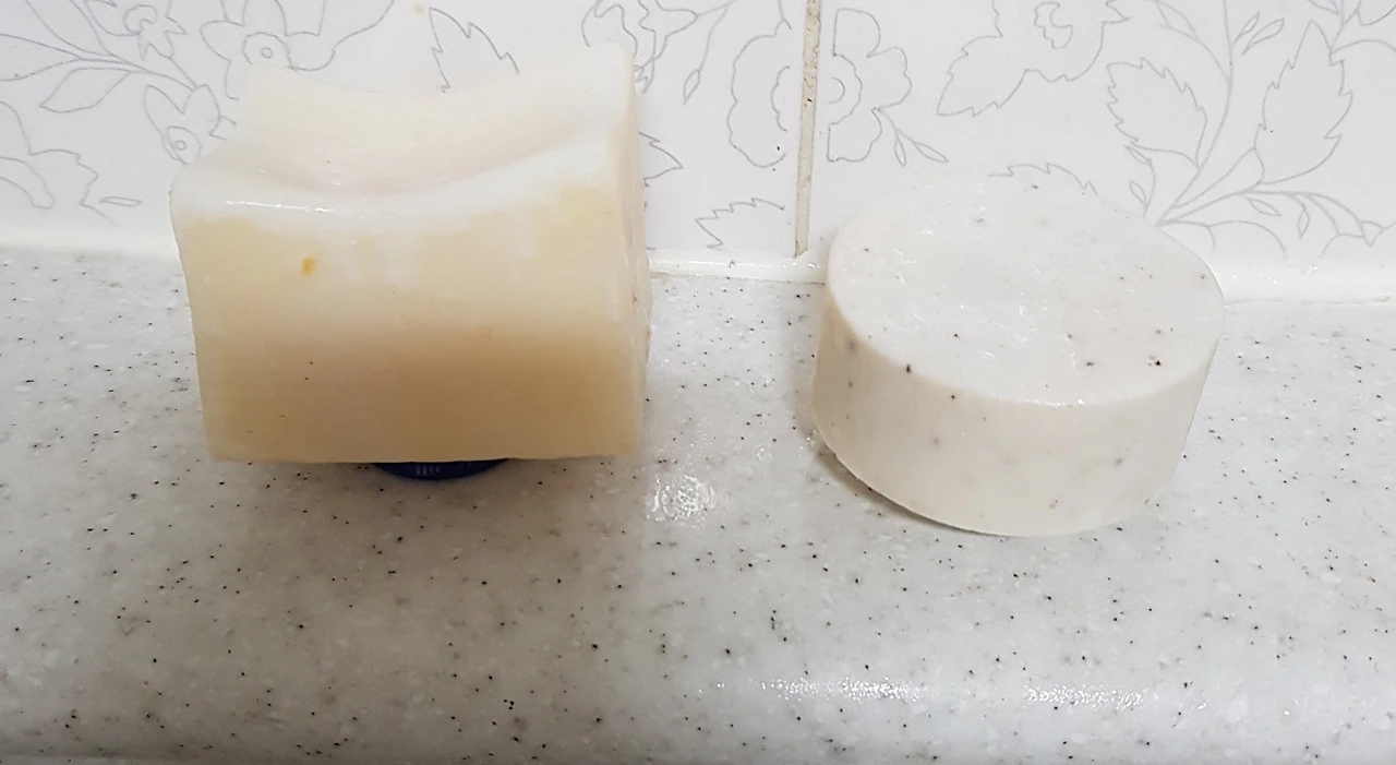생수병 뚜껑으로 비누받침을 만든 한살림 주방비누(좌)와 동구밭 주방비누(우)