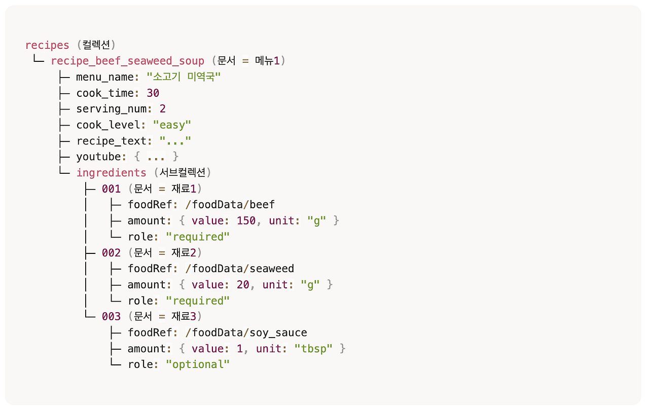 너는 Firebase 설계자야. {내 서비스 의도 + 사용 흐름 + 활용할 데이터 항목(ex. 요리명, 재료명, 재료 분량..) + 현재 연결해야 하는 데이터 항목(ex. 음식명)}을 기반으로 Firebase 설계도를 트리구조로 정리해 줘.
