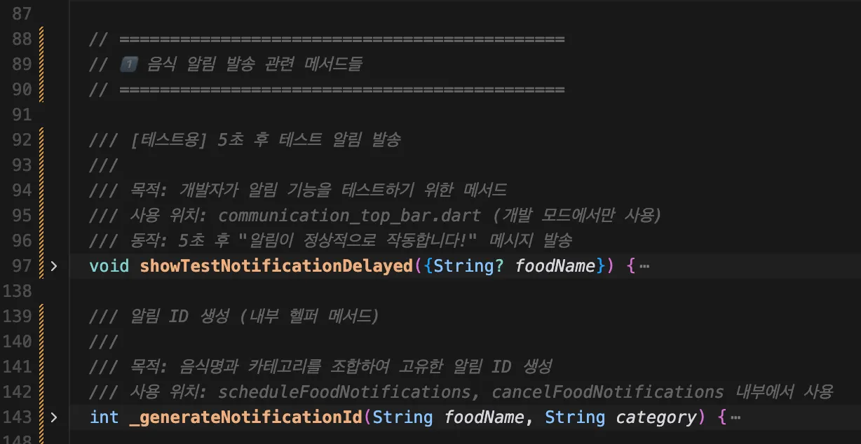 각 구성이 지금 어떤 목적 및 역할을 갖고 있는지 알려줘. {예를 들어, '음식의 예약 알림 설정(권장폐기일 기반)'과 '알림 예약(내부 메서드)' 간 차이가 뭔지 모르겠어. 그리고 '5초 후 테스트 알림 (Background 테스트용)', '5초 후 즉시 알림 발송 (권장폐기일 수정 시 사용)' 간 차이도 아직 이해가 안 가.} 만약 지금 사용하지 않아서 삭제해도 된다면 삭제하고, 간단한 목적 및 역할을 주석으로 남겨줘. 나는 개발자가 아니기 때문에, 이후에 다시 읽어도 이해가 되도록.