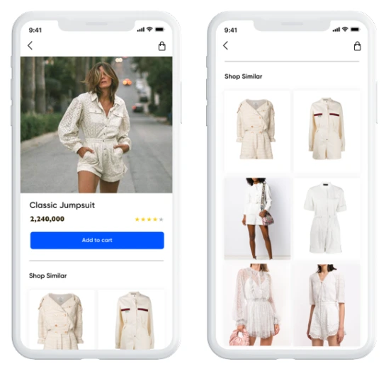 왼쪽의 이미지처럼 옴니어스가 이미지 속의 상품을 인식하고 유사한 상품을 추천해주는 서비스입니다. 여러분들이 커머스에서 "이 상품은 어떠세요?"같은 걸 보셨다면 그게 바로 저희 옴니어스의 서비스였을 수 있어요!