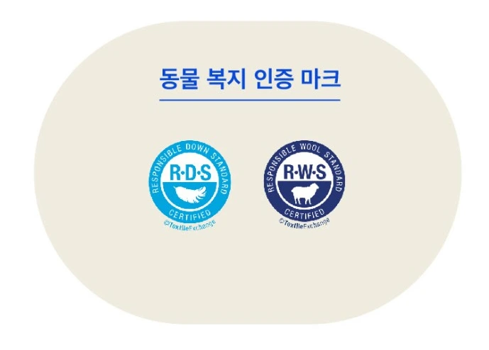 오리와 거위의 사육 및 도축을 포함한 우모(다운) 생산 과정의 투명성 및 동물 학대 여부를 심사하는 인증입니다. 농장부터 완제품 생산 및 판매에 이르는 공급망 전 단계에 걸쳐 심사합니다. 사육과 도축 시 동물에게 먹이를 강제로 주입하거나 살아 있는 상태에서 털을 뽑는 라이브 플러킹(Live Plucking) 여부를 확인하는 등 동물의 5대 자유 원칙을 보장합니다.