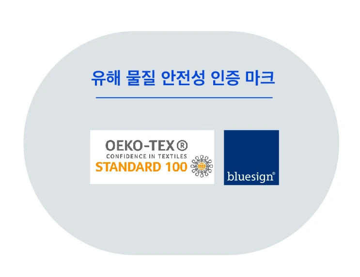의류와 가정용 섬유 제품에 사용한 모든 소재에 대해 유해 물질 테스트를 진행했으며 인체 건강에 무해하다는 것을 인증합니다. 법적 규제・비규제 물질 100여 개에 대한 실험을 진행해서 국제 기준보다 엄격한 기준치로 심사합니다.