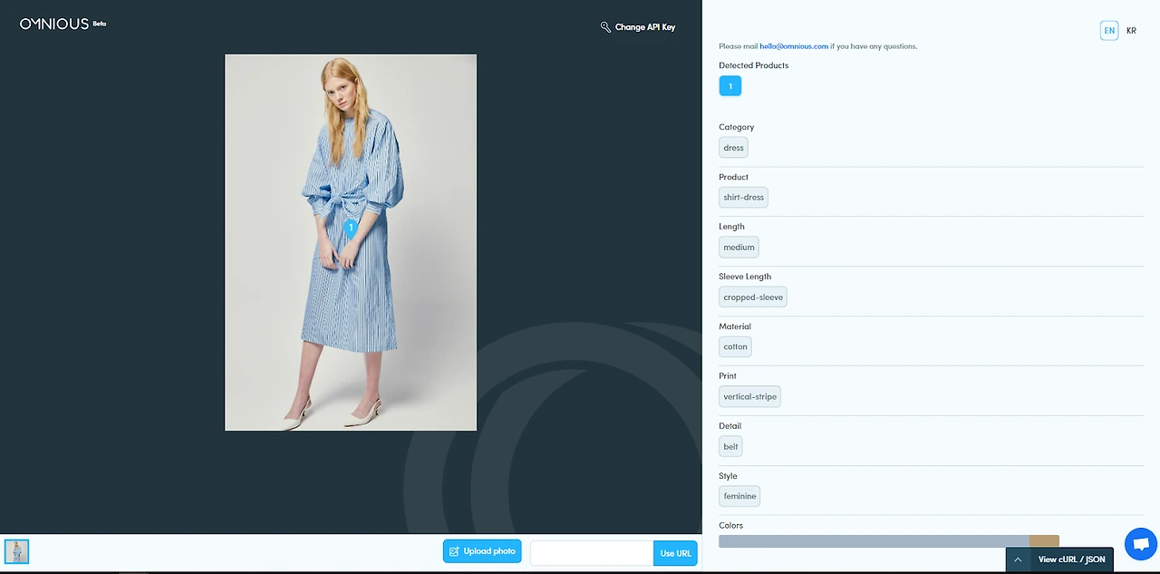 옴니어스 태거는 API 형태로 제공됩니다. 간단한 연동 과정을 거친 후, 실제 상세페이지에 사용되는 상품 사진을 넣으면 다양한 속성 정보들이 빠르게 태깅됩니다. 여기서 수집된 태그값은 상품 태그와 검색 필터에 바로 적용됩니다. API 연동 없이 개인 사업자도 손쉽게 활용할 수 있는 옴니어스 스튜디오 서비스도 출시되어 있습니다.