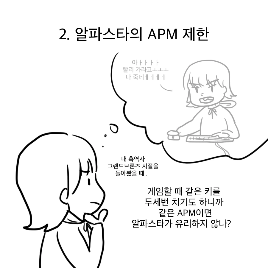 2) 알파스타의 APM 제한 : 아무래도 AI가 인간보다 컨트롤이 빠르겠죠? 이번 경기에서 알파스타의 APM(Actions Per Minute, 1분당 내리는 명령의 수)은 평균 277 정도였고 TLO, MaNa는 각각 678과 390 수준이었습니다. 알파스타가 손이 빨라서 이긴 건 아니라는 말이지만, 이런 단순 APM 비교는 의미가 없다는 의견도 있습니다. 사람은 게임을 할 때 같은 키를 여러 번 누르곤 하잖아요. 알파스타에겐 이런 무의미한 키 누름이 없을 거니까 단순 APM 제한은 의미가 없을 테고 인간이 피지컬에서 불리하다는 거죠.