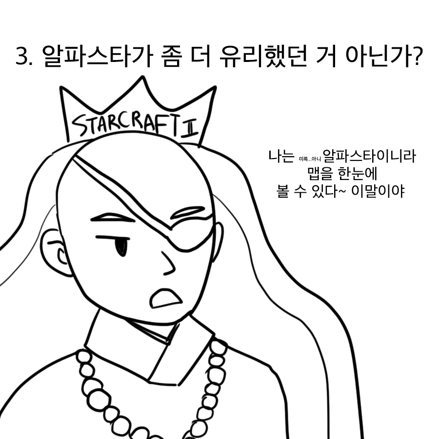 3) 알파스타가 좀 더 유리했던 거 아닌가? : MaNa 선수가 11번째 대전에서 승리를 거둬 알파스타 대 인간 대전은 10대 1로 끝났는데요. 마지막 경기에 참여한 건 이전까지와는 다른 알파스타였습니다. 앞서 10번 승리를 거두었던 알파스타는 활성화된 모든 맵을 한 번에 볼 수 있었습니다. 맵핵은 아니고요, 스타크래프트는 맵이 넓으니까 인간은 맵의 시야를 이리저리 둘러보며 게임을 해야 하잖아요? 그 부분을 제한해 인간과 비슷한 시야를 가지게 만든 것이 두 번째 알파스타였습니다. 마지막 경기에서 MaNa 선수가 승리한 건 첫 번째 알파스타가 가졌던 저런 강점 때문이 아니었나 하는 목소리가 있습니다. 물론 MaNa 선수가 지난 다섯 번의 경기를 통해 알파스타의 전략을 파악했다고 볼 수도 있겠죠!