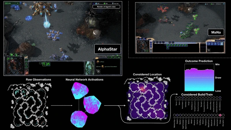 이세돌과 맞붙었던 알파고처럼 알파스타도 수많은 게임 플레이 데이터를 학습하며 탄생했습니다. 2주 동안 약 200년어치 스타크래프트 게임 플레이를 학습했대요. 그러다 알파스타끼리 맞붙는 학습 환경을 거쳐 점차 프로토스 전사로서 다양한 전략들을 구상하게 되었고요. 버그가 적고, 가장 진보된 기술을 가진 종족이기에 프로토스에 집중해 학습하기로 했다네요.