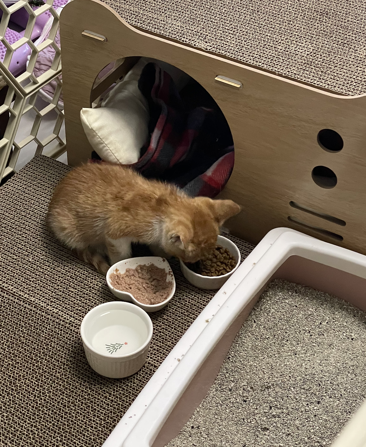 그렇게 부랴부랴 집에 도착해서 문을 연 순간. 고양이 뀨꾸는 숨숨집에서 눈을 뜨고 나에게 아는 체를 해주었다. 밥그릇부터 확인을 했는데 2개가 텅텅 비어있는 걸 보는 순간, 기특하면서도 밥이 모자라지는 않았을까 하는 마음에 씻지도 못하고 바로 새로운 밥을 꺼내서 놓아주었다.